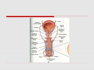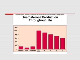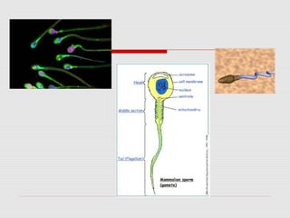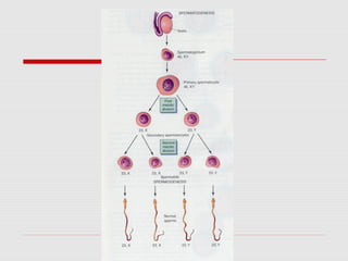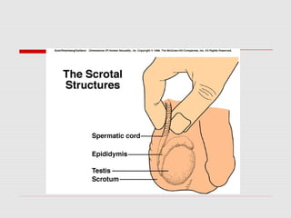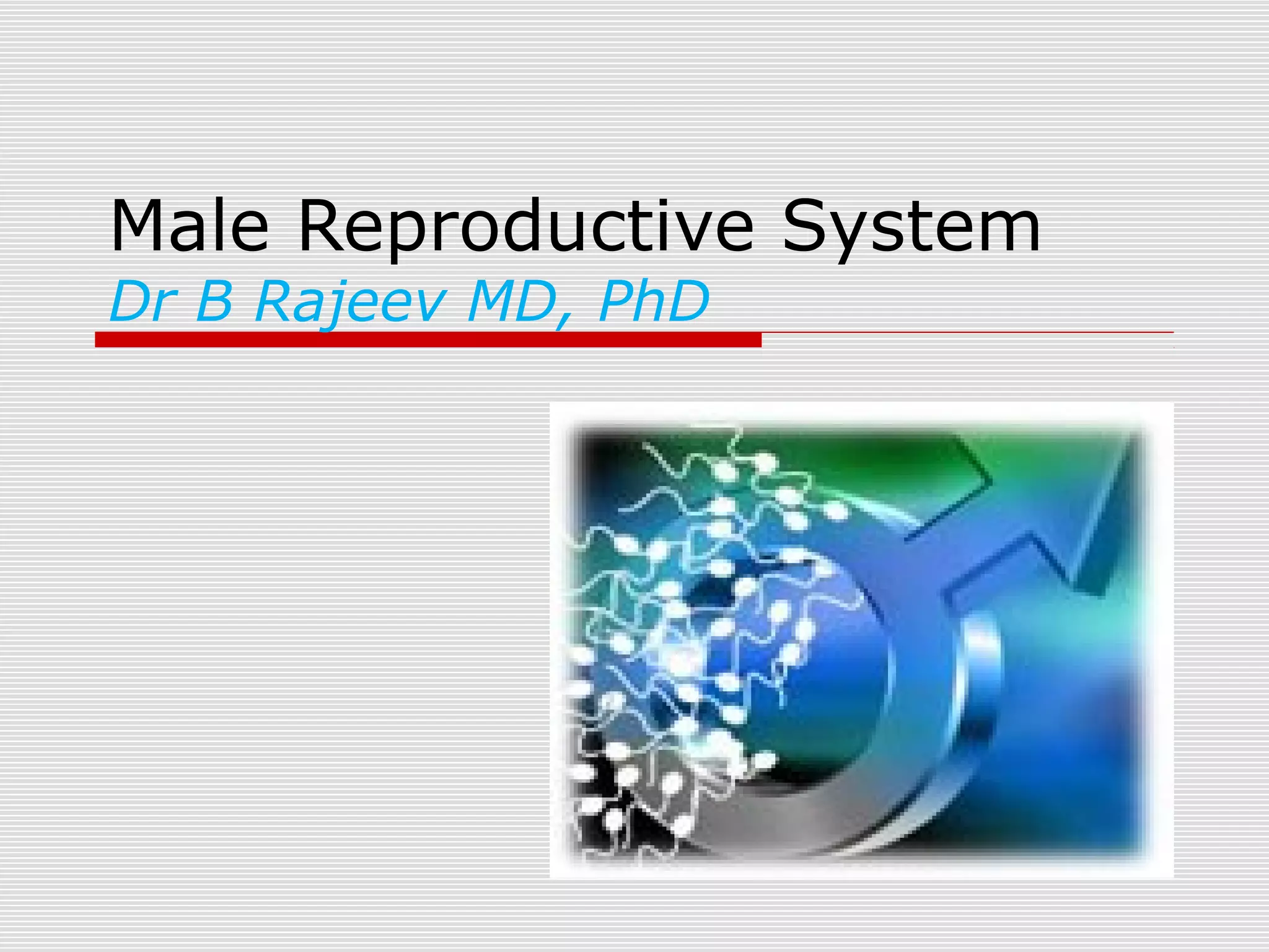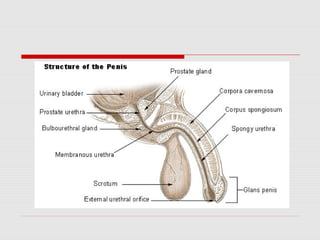 The male reproductive system produces and transports sperm. During puberty, the testes enlarge and begin producing testosterone and sperm through spermatogenesis within the seminiferous tubules. Mature sperm pass through the epididymis, vas deferens, and urethra to be ejaculated with fluids from the seminal vesicles, prostate, and bulbourethral glands. The penis becomes erect through increased blood flow, allowing for sexual intercourse and delivery of sperm.