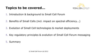 1. Small cells provide several benefits like increased network capacity and spectral efficiency by offloading traffic. They complement existing cellular networks and Wi-Fi networks.