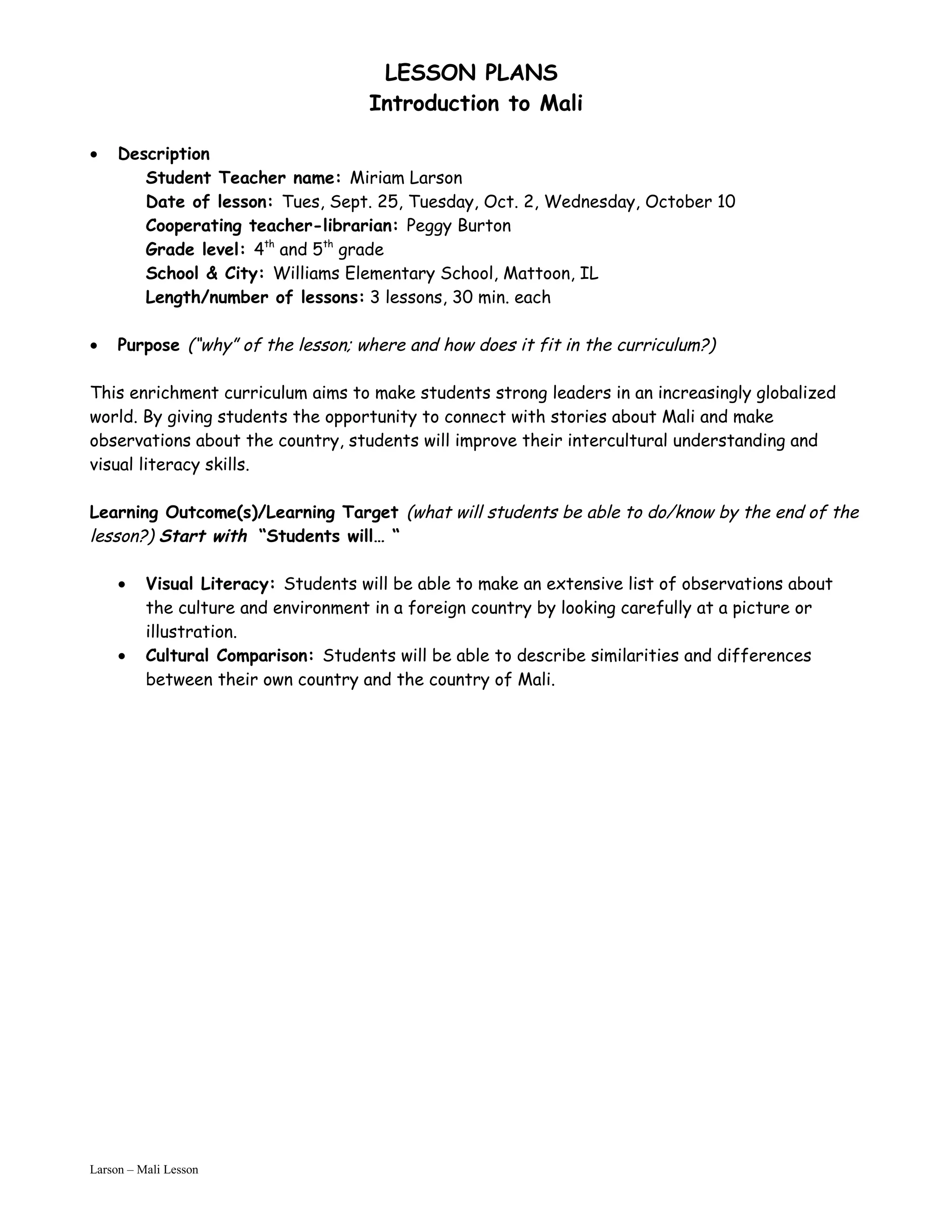 These lesson plans introduce students to the country of Mali through stories and visuals. Over four 30-minute lessons, students will read a story about a girl losing her tooth in Mali, make observations about Mali culture from illustrations, discuss what can be learned from stories versus facts, and examine photographs from a teacher's friend's trip to Mali to practice visual literacy skills. The lessons aim to improve students' cultural understanding and ability to make informed observations about other places.