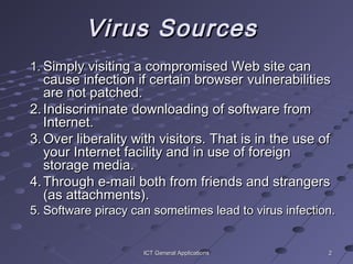 The document discusses good internet habits and how to avoid malware and viruses when using ICT applications. It notes that viruses can be obtained by visiting compromised websites, downloading unknown files from the internet, opening suspicious emails or attachments, and using untrusted external storage devices. It provides tips for reducing risks like using antivirus software, only downloading from trusted sources, using firewalls and strong passwords. The document outlines different types of storage media and characteristics of malware like replicating (worms), using system resources, transmitting across networks, and fulfilling the designer's intentions like deletion or corruption. It emphasizes keeping antivirus software current to protect devices and networks from various cyber threats.