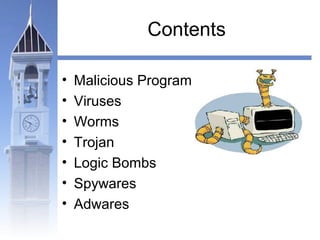 This document discusses different types of malicious programs including viruses, worms, Trojan horses, logic bombs, spyware, and adware. Viruses replicate by inserting copies of themselves into other programs or files. Worms replicate across network connections without needing host programs. Trojan horses appear useful but contain hidden malicious code. Logic bombs trigger when specific conditions occur. Spyware collects user information without consent. Adware automatically displays advertisements. The document provides examples of different malware types and advises users to only install trusted software and keep anti-virus software updated.