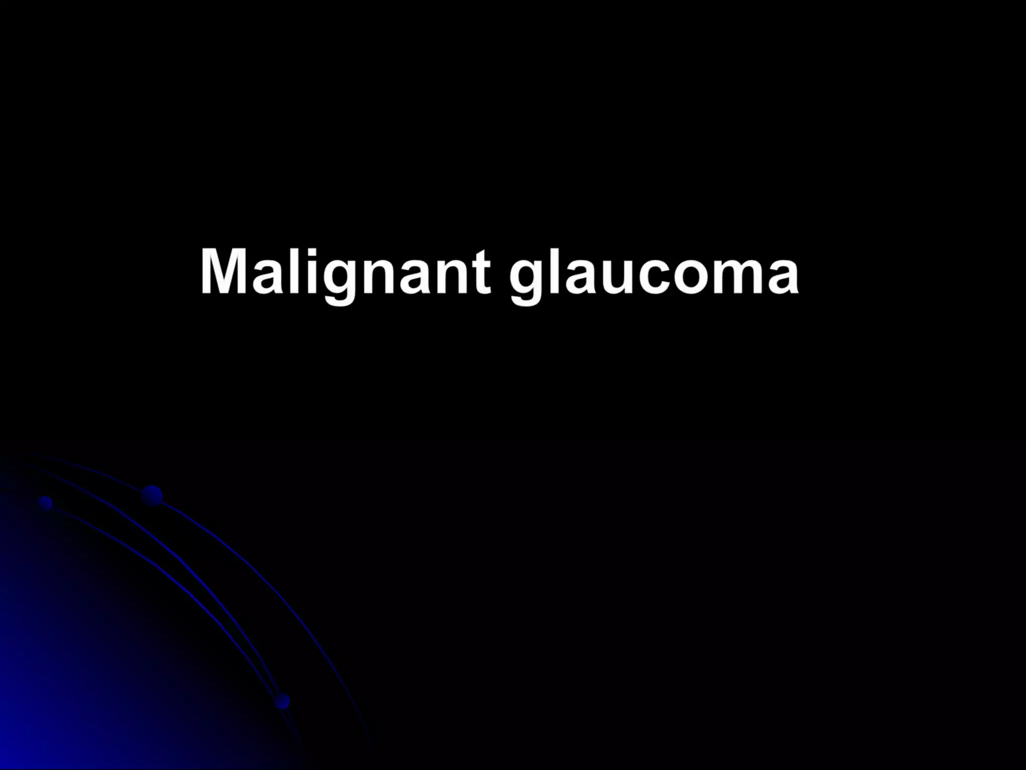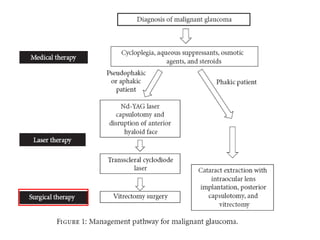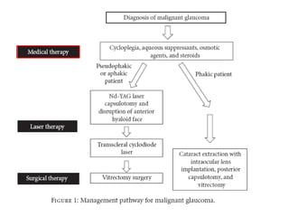 Classic malignant glaucoma is a rare complication of incisional surgery for angle-closure glaucoma where the anterior chamber shallows due to forward movement of the iris-lens diaphragm despite increased intraocular pressure. It can occur in eyes with or without glaucoma and may be triggered by laser treatment, miotics, or trabeculectomy. Treatment involves reducing pressure and vitreous volume medically or surgically with vitrectomy. Definitive management is phacoemulsification, intraocular lens implantation, and removal of the posterior capsule during vitrectomy.