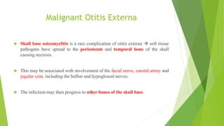 Malignant otitis externa (MOE) involves skull base osteomyelitis due to the spread of infection, primarily affecting elderly and diabetic patients, with Pseudomonas aeruginosa being the most common pathogen. Diagnosis includes clinical symptoms, microbiological cultures, and imaging studies, while treatment focuses on systemic antibiotics and glycemic control, with surgery considered for severe cases. Prognosis is influenced by various factors, including the presence of cranial neuropathies and positively cultured Aspergillus, with recurrence rates being significant even after treatment.