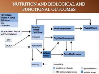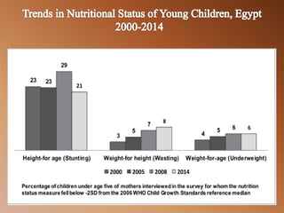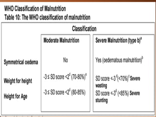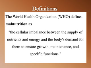 Malnutrition refers to both undernutrition and overnutrition. Undernutrition is when the diet does not provide enough calories and protein for growth and maintenance. It can result in stunting, wasting, and micronutrient deficiencies. Overnutrition is consuming too many calories and can lead to overweight and obesity. Globally in 2013, 51 million children under 5 had wasting and 161 million had stunting, with most cases in Asia and Africa. While malnutrition rates have declined overall, they continue to rise in parts of Africa. Vulnerable groups like young children are most at risk.