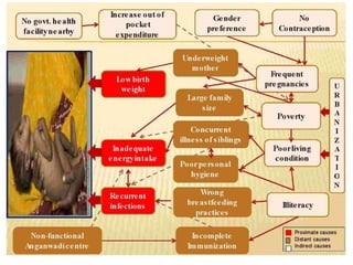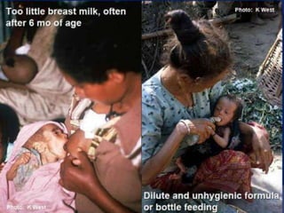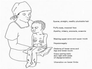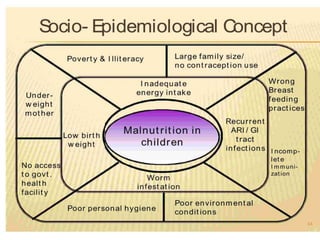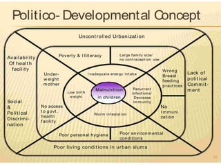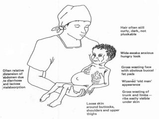 The document discusses malnutrition as a critical health issue, particularly in children, highlighting its various forms such as protein-energy malnutrition (PEM) including marasmus and kwashiorkor. It details the causes, effects, and management strategies for malnutrition, emphasizing the need for preventive measures and national nutritional programs in India, where a significant portion of children suffer from malnutrition. The document outlines the importance of proper nutrition for growth and health, and addresses the role of socio-economic factors in the prevalence of malnutrition.