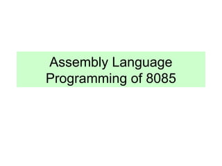 This document provides an overview of programming with the 8085 microprocessor using assembly language. It discusses the 8085 programming model including registers, flags, and addressing modes. It also covers the instruction set categories such as data transfer, arithmetic, logical, and branching operations. Examples are given of writing assembly language programs, including adding two numbers, handling results larger than 8 bits, and separating digits of a hexadecimal number. The document is intended to teach assembly language programming for the 8085 microprocessor.