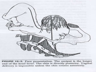 Dokumen tersebut membahas mengenai berbagai malpresentasi dan malposisi janin selama persalinan, seperti presentasi kepala dengan oksiput posterior, presentasi dahi, presentasi muka, presentasi bokong, presentasi ganda, serta komplikasi yang mungkin terjadi. Dokumen ini juga menjelaskan penanganan dan mekanisme persalinan pada setiap kondisi tersebut, serta merekomendasikan seksio sesarea pada kondisi-kondisi tertentu.
