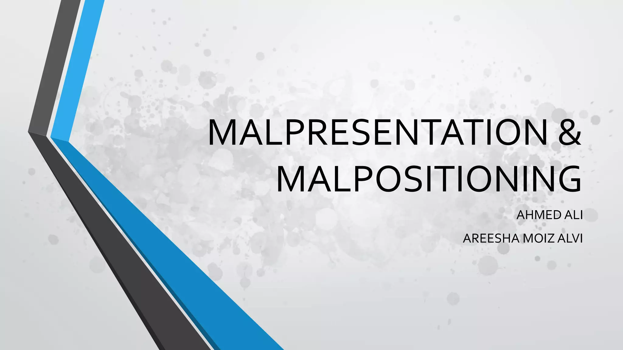 The document discusses malpresentation and malpositioning of the fetus during labor, particularly focusing on the occipito posterior position and its types, causes, and diagnosis. It outlines the mechanisms of labor in this malposition, the common management strategies for the first and second stages of labor, and various presentations of the fetus, including cephalic and breech presentations. Additionally, it addresses the complications associated with these positions and presents management options such as cesarean section, vacuum extraction, and manual rotation.