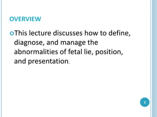 This document discusses fetal position, presentation, and abnormalities. It defines terms like fetal attitude, lie, and presentation. The normal position is cephalic presentation with head down. Breech presentation, where the buttocks or feet are down, occurs in about 4% of births and can complicate delivery. Diagnosis involves abdominal and vaginal exams plus ultrasound. Breech babies may be delivered via planned c-section or, in some cases, vaginally if the fetus is small and the pelvis adequate. Risks of breech delivery include cord prolapse and fetal distress.