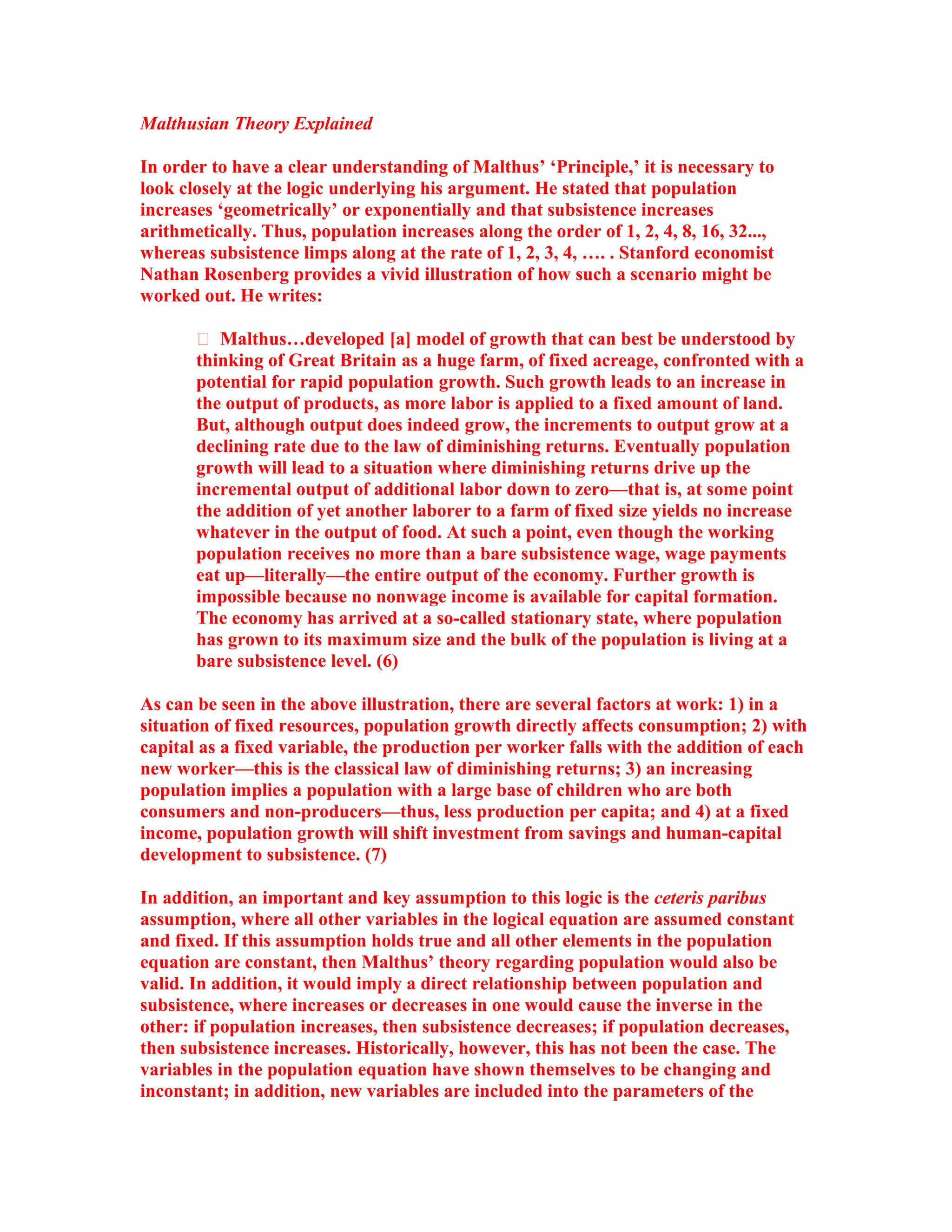 Malthusian theory proposed that population grows exponentially while the food supply grows arithmetically, leading to population outstripping the food supply. Neo-Malthusians revived these concerns in the 20th century, predicting mass starvation. However, their predictions did not come true due to technological advances increasing food production. While some neo-Malthusians continue predicting famine, data from the UN and World Bank show that global food production has increased steadily, keeping pace with population growth through yield improvements and the green revolution.