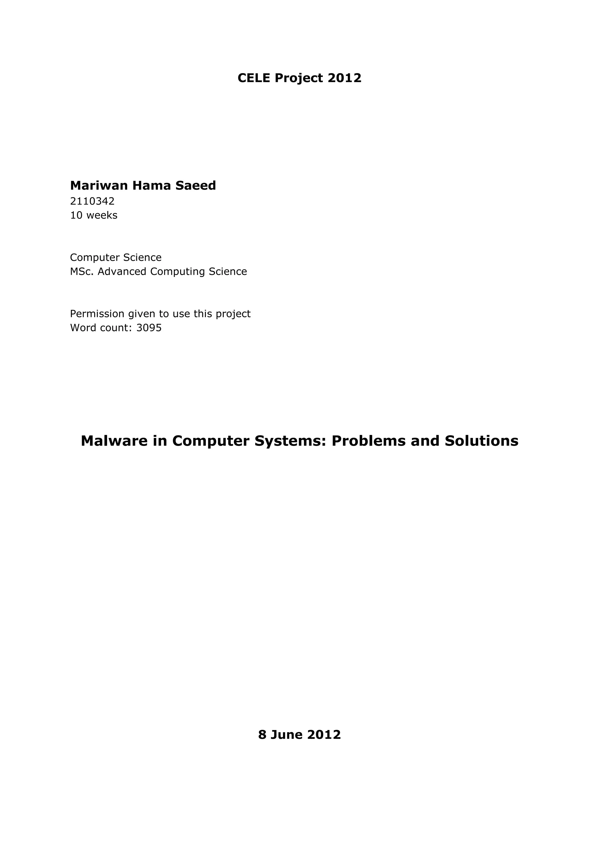 This document provides a summary of a project about malware problems and solutions. It investigates four types of malware (viruses, worms, Trojans, and spyware) and provides three effective countermeasures (firewalls, security software, and training). The project was completed by Mariwan Hama Saeed for their computer science master's program and contains 3095 words.
