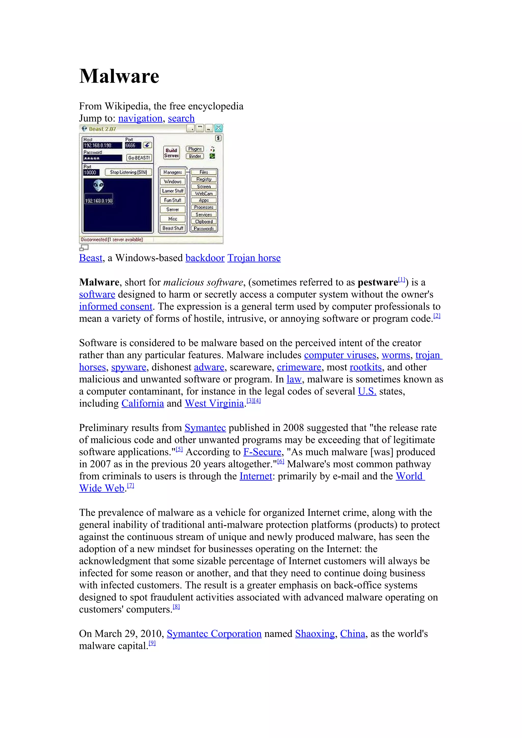 Malware is malicious software designed to harm or access a computer system without consent. It includes viruses, worms, trojan horses, spyware, and other unwanted programs. Malware was originally written as experiments or pranks, but is now often used for criminal purposes like identity theft or installing botnets for spam or denial of service attacks. It spreads through the internet and removable media. Malware authors aim to conceal the malware and prevent its removal through techniques like rootkits.