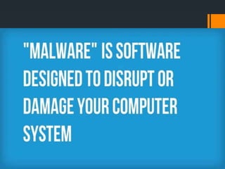 Malware comes in various forms and can infect computers through many sources such as malicious websites, pirated software/media, and emails. There are three main types of malware: viruses, trojans, and worms, which operate differently to disrupt computers. Users can protect themselves by only visiting trusted sites, avoiding suspicious ads and emails, and using antivirus and firewall software to block unauthorized access and programs. Malware aims to access personal information and systems without permission.