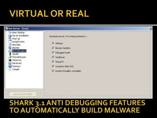 This document provides an overview of a game plan for analyzing malware. It will include a theoretical overview today followed by detailed presentations on virtualization, honeypots/honeynets, debugging, and more. It discusses setting up a controlled lab environment for analysis including static analysis, network traffic analysis, disk/file system analysis, and memory analysis. It also discusses various tools that can be used for each part of the analysis process.