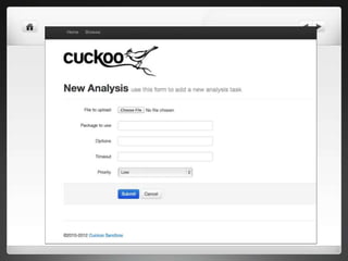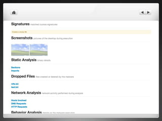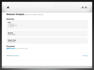 The document notes that manually analyzing malware can be time consuming and boring. MART was created to automate parts of the process such as sample acquisition, analysis using tools like Cuckoo Sandbox, and reporting. This reduces the time spent by malware analysts and allows them to focus on more complex samples. The system also aims to address limitations of virtual machine-based analysis by integrating additional techniques. Overall, MART streamlines malware analysis as a hobby while cutting costs compared to paying for commercial solutions.