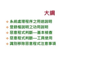 本文檔提供有關惡意程式分析的基礎知識,包括系統處理程序的分類和用途、登錄檔的自動啟動位置以及惡意程式的基本檢查方法。指導用戶識別和移除惡意程式時需要注意的細節,如合法程序的檢查及防毒軟體的更新。文中詳細列出多種系統服務和通用程式的特徵,以便用戶能夠更好地進行安全管理。