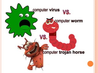 This document provides an overview of different types of malware: viruses, Trojan horses, and worms. It defines malware as malicious software designed to damage computers without consent. Viruses attach to executable files and require human action like opening an infected file to spread. Trojan horses appear to be useful software but can steal information or damage systems. Worms can spread without human action by taking advantage of file sharing and replicating large numbers of copies on a system. The document explains key differences between these types of malware and how understanding them helps protect computers.