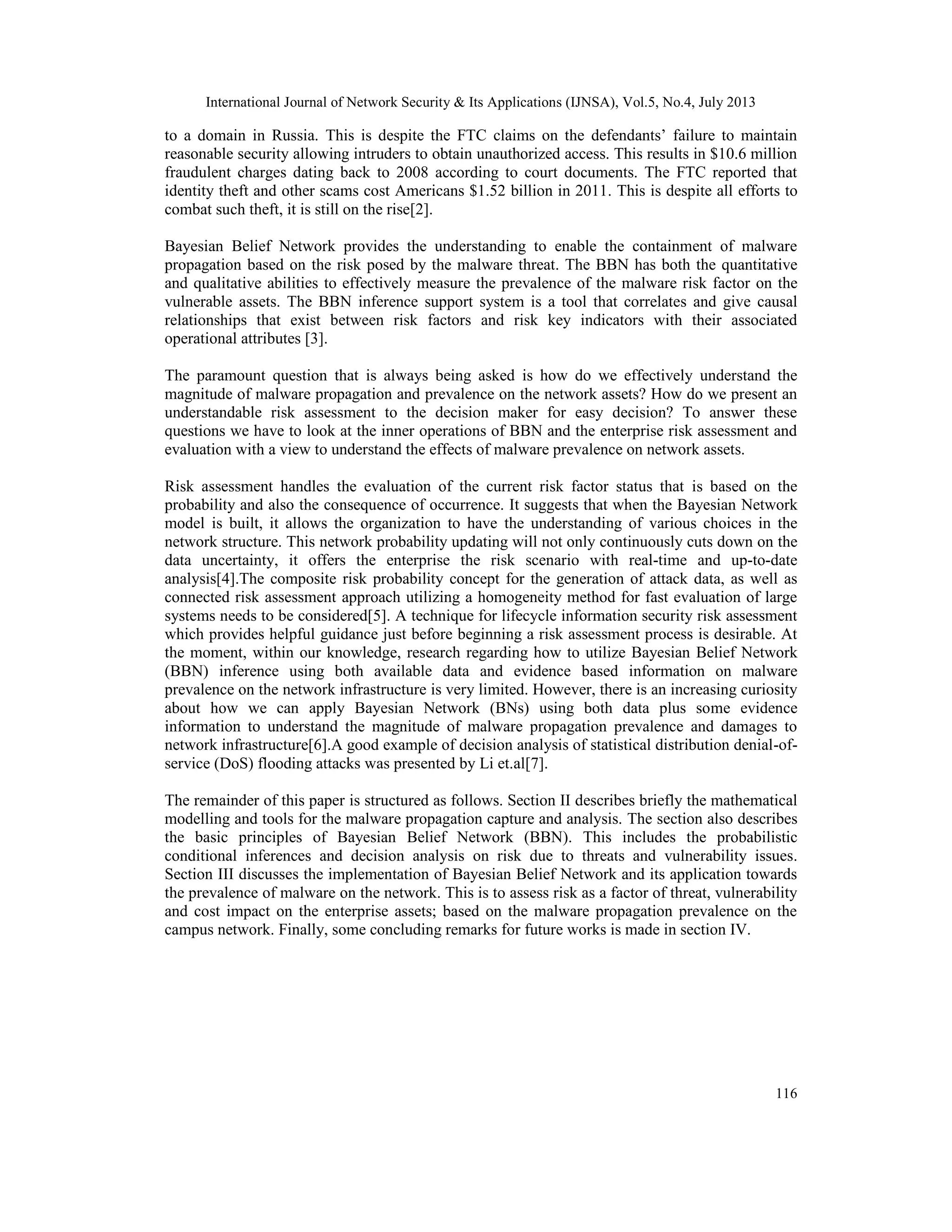This document discusses using a Bayesian Belief Network (BBN) to analyze malware risk on a university campus network. It begins by introducing the campus network monitoring tools and SIR epidemiological model used to model malware propagation. It then provides background on BBN principles, including defining nodes, conditional probabilities, and using the network to compute joint probabilities. The document proposes applying a BBN to assess malware prevalence risk by relating threat, vulnerability, and cost impact on network assets. It aims to provide understandable risk assessments to inform decision making.