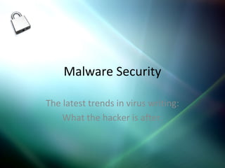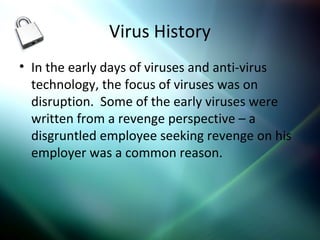 The document discusses the evolution of viruses from disruption to profit-seeking. Early viruses aimed to damage systems or gain notoriety, but today's viruses spread quietly to steal identities for money. The document provides tips to protect online identity, including keeping software updated, checking URLs, and verifying expected emails. Financial institutions do not use email for sensitive information.