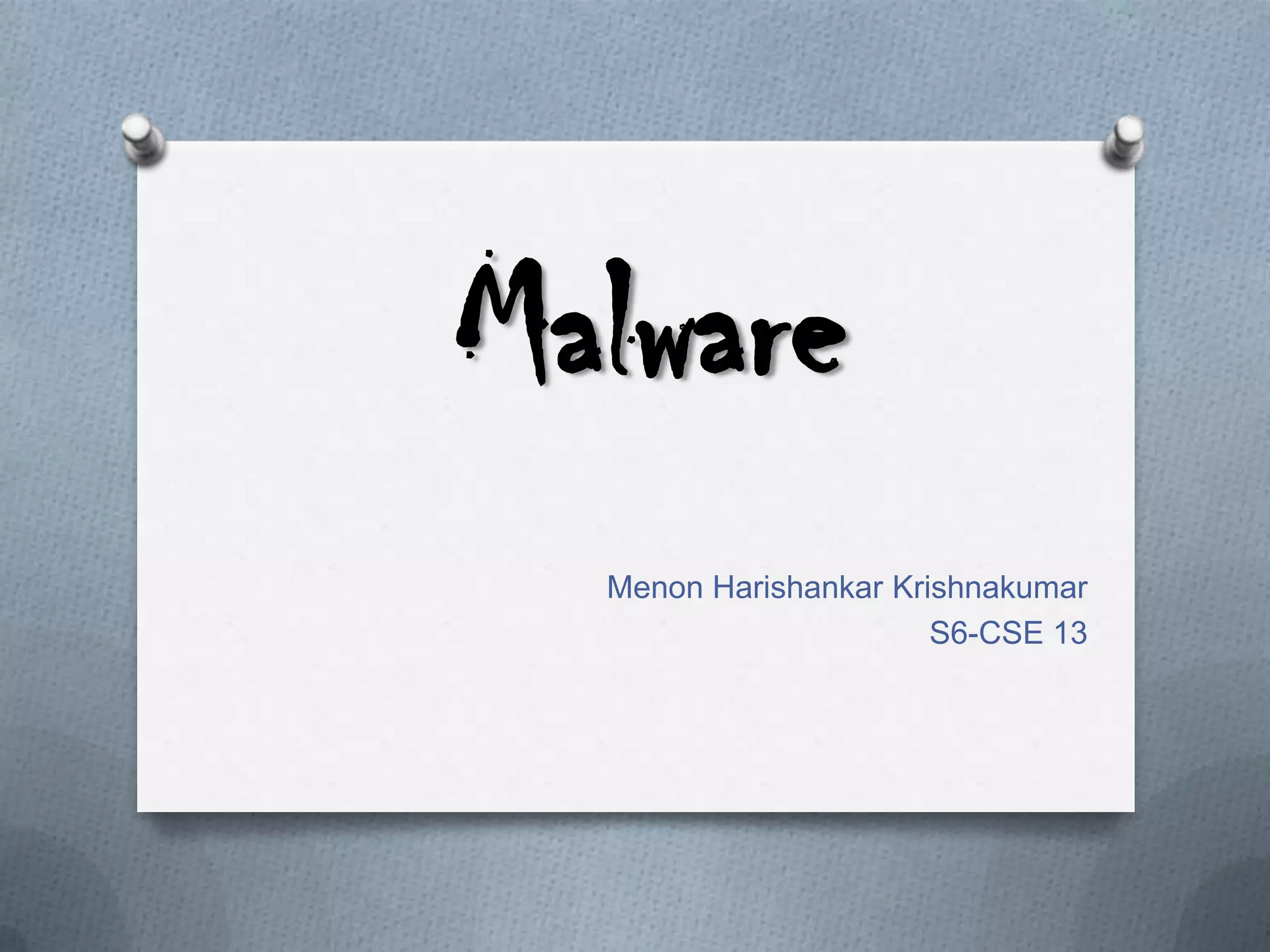 The document provides an overview of malware, including its definition, types (like viruses, worms, and trojans), historical malware examples, and detection methods. It discusses notable malware incidents such as the Morris Worm, Code Red, and SQL Slammer, and highlights future trends in malware like polymorphic and metamorphic viruses. Methods for malware detection include signature detection, change detection, and anomaly detection, each with their advantages and limitations.
