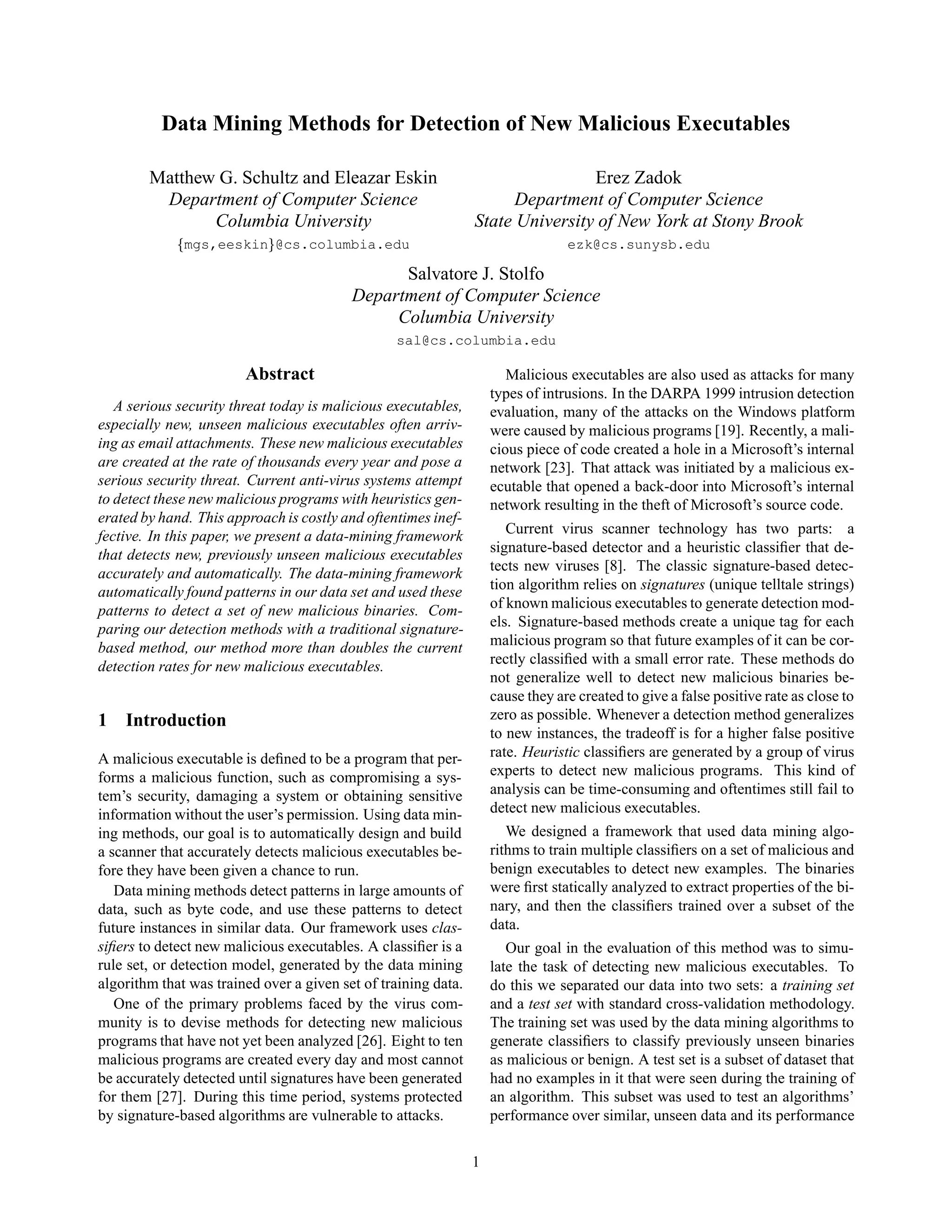 This document proposes a data mining framework to automatically detect new malicious executables. It extracts features from binaries and uses three data mining classifiers trained on these features: a rule learner, probabilistic classifier, and multi-classifier system. When evaluated on a test set, the framework detects 97.76% of new malicious binaries, more than doubling the detection rate of a signature-based method.