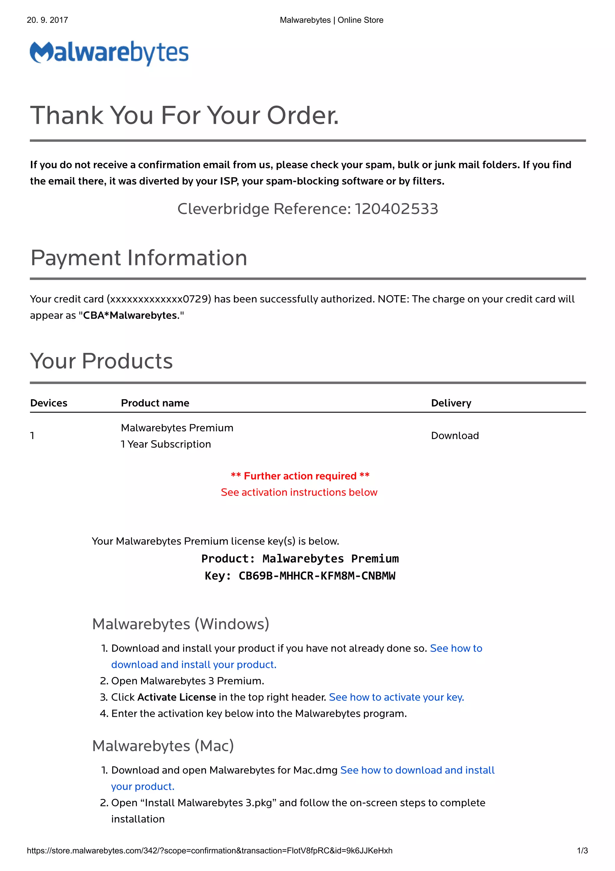 This document is an order confirmation for a 1-year subscription to Malwarebytes Premium. It provides the customer's payment information, the activation key for their subscription, download links for installing Malwarebytes on Windows and Mac devices, and instructions for activating their subscription on each platform. The customer will be billed €39.99 annually on September 20th to renew their subscription.