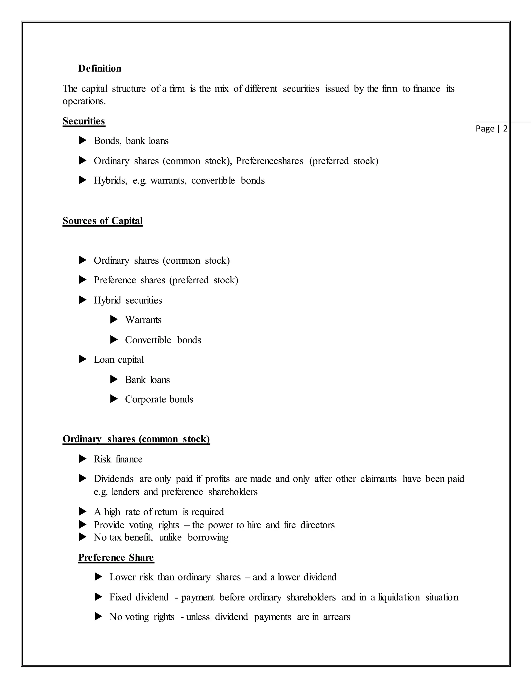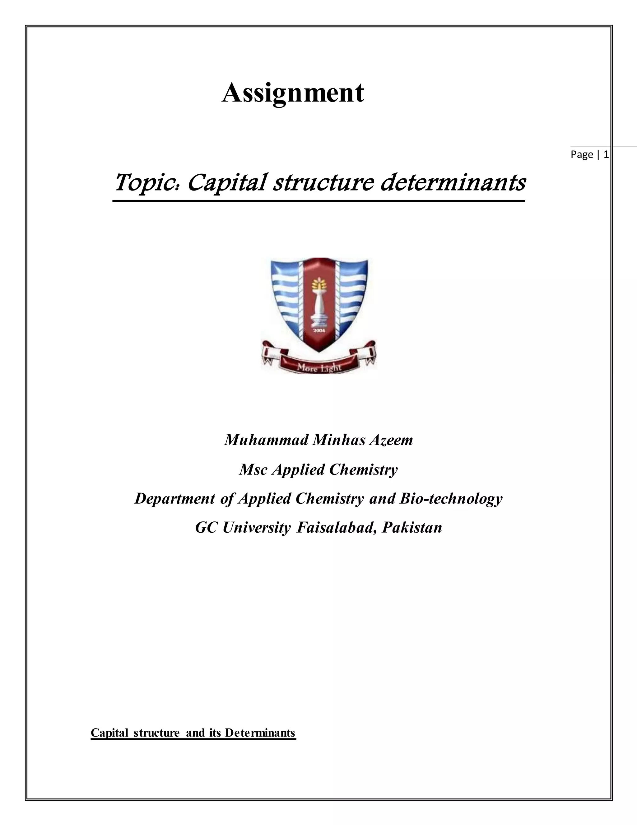 This document discusses capital structure and its determinants. It defines capital structure as the mix of different securities used to finance a firm's operations, including bonds, loans, ordinary shares, and preferred shares. It then lists and describes various determinants that must be considered when determining a firm's optimal capital structure, including financial leverage, growth and stability of sales, cost of capital, cash flow ability, nature and size of the firm, control, flexibility, requirements of investors, capital market conditions, assets structure, purpose and period of financing, costs of floating securities, personal considerations, corporate tax rates, and legal requirements. Finally, it briefly outlines four major capital structure theories: the net income approach, net operating income approach, Modig