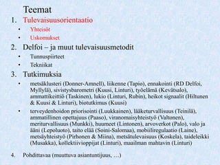 Tulevaisuusorientaatio: tulevaisuuden tekijä,mahdollisuuksien näkijä, uhkien tunnistaja, sivustaseuraaja (Amaran roolit)What will you do with the gathered data?Think about it before you gather it!Concentrate on statements or arguments?Gathering of authentic statements/arguments or content analysis?Quantitative data? Think about scales!do not use 5-Likert (or other ordinal scale) scale if you do not have touse rather interval scale or relative scaleuse only one or two scale typesFeedback from the first round may includeAnswers from the previous round + same questions againSeparate report and better questionsEach participant’s own answers related to othersP. Tapio: TUTU 2, 17.2.2005
