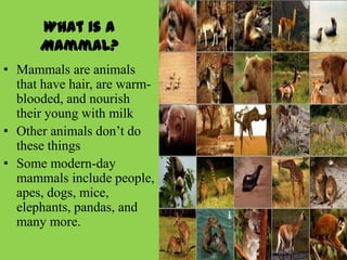 Mammals are warm-blooded animals that nourish their young with milk. They come in a wide variety of forms, including people, apes, dogs, mice, elephants and pandas. Mammals have developed different adaptations to live in diverse environments, such as fur and fat to survive cold climates or sweating and panting to release heat in warm places. Mammals also have different diets and include herbivores, carnivores, omnivores and insectivores. They vary greatly in size, from the smallest pygmy shrew and bumblebee bat to the largest blue whale.
