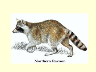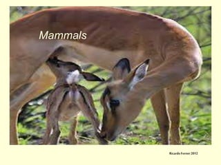 This document lists various types of mammals organized into categories including carnivorous mammals, marine mammals, primates, rodents, ungulate mammals, and others. It includes over 60 different mammal species ranging from bears, big cats, and dogs to dolphins, whales, monkeys, mice, deer, horses, and more. The list provides the scientific names of mammals.
