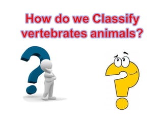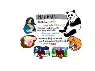 This document presents key characteristics of mammals. It states that mammals have lungs and breathe air, most give live birth and feed their young with milk, and while many have four legs, humans have two legs and two arms. It also notes that mammals are covered with skin and hair or fur, and aquatic types have fins instead of legs.