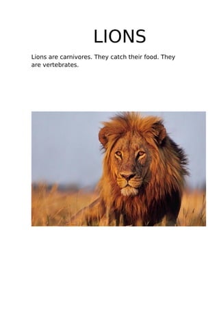 This document discusses several different types of mammals: - Lions, cats, bats, dolphins, giraffes, elephants, the Iberian linx, and dogs are all described. Lions, cats, bats, dolphins, and the Iberian linx are carnivores, while giraffes, elephants, and dogs can be herbivores or omnivores. All of these mammals are vertebrates. Bats are uniquely able to fly among mammals.