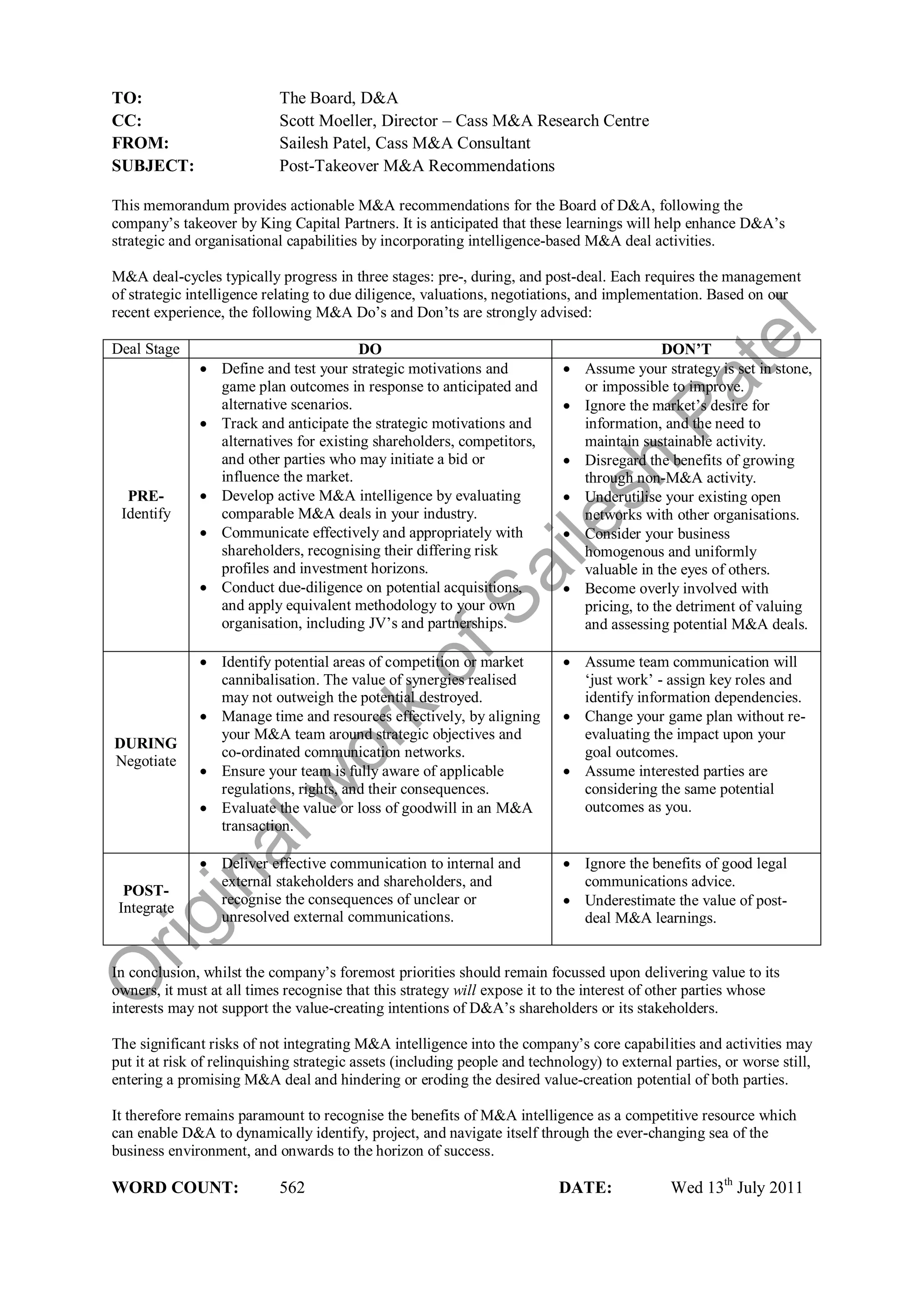 This memorandum outlines post-takeover M&A recommendations for D&A following its acquisition by King Capital Partners. It highlights the importance of integrating M&A intelligence into the company's strategy to enhance its organizational capabilities and navigate market challenges. Key dos and don'ts are provided for each stage of the M&A deal cycle to improve outcomes and mitigate risks.