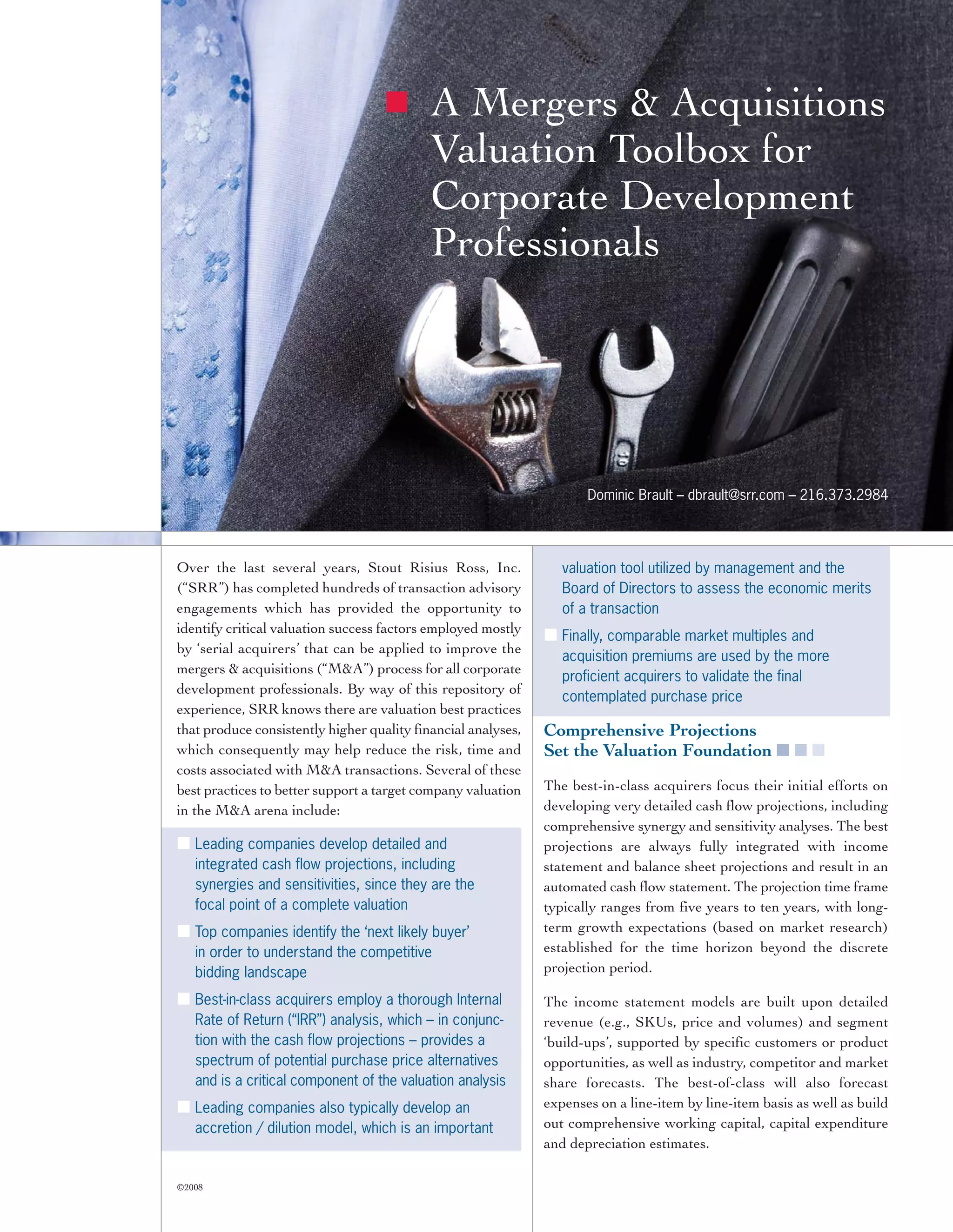 This document provides an overview of best practices for target company valuation in mergers and acquisitions identified by Stout Risius Ross, Inc. Key aspects include: