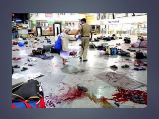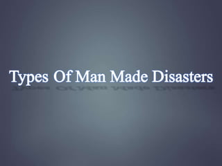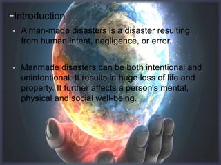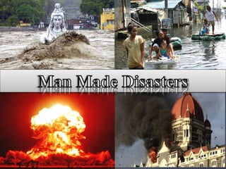 Man-made disasters are caused by human intent, negligence or error. They can be intentional or unintentional and result in loss of life and property as well as long-term psychological impacts. Examples include transportation accidents involving aviation, rail or road travel due to neglect. Common causes are weapons, chemicals that are carelessly handled, ignorance, and illiteracy. Precautions must be taken for different types of disasters like keeping protected from nuclear radiation, avoiding chemical areas, and preventing electrical fires. The 2008 Mumbai attacks were a coordinated terrorist attack across Mumbai that killed 173 people and wounded 308 over four days through shootings and bombings at various locations including train stations, hotels, and a Jewish community center.