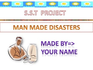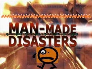 Man-made disasters are caused by technological or human factors and result from events like fires, transport accidents, industrial incidents, oil spills, nuclear explosions, and radiation. Examples of man-made disasters include stampedes, fires, transport accidents, industrial accidents, oil spills, nuclear explosions and radiation, and acts of war or terrorism. Precautions must be taken to prevent these events from occurring or mitigate the damage if they do, such as proper building wiring and containment of dangerous chemicals or nuclear materials.