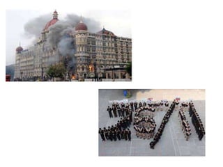 Man-made disasters can be both intentional and unintentional, and cause immense human suffering and economic damage. They include nuclear accidents, biological and chemical disasters, acts of terrorism, and various transportation accidents. Some specific examples that resulted in massive loss of life discussed in the document are the Bhopal gas tragedy, Kuwait oil fires during the Gulf War, Mumbai terrorist attacks of 2008, Jallianwala Bagh massacre, and London's killer fog of 1952. Precautions are needed to minimize risks from these disasters, such as proper handling of hazardous materials and informing authorities of any suspicious activity.