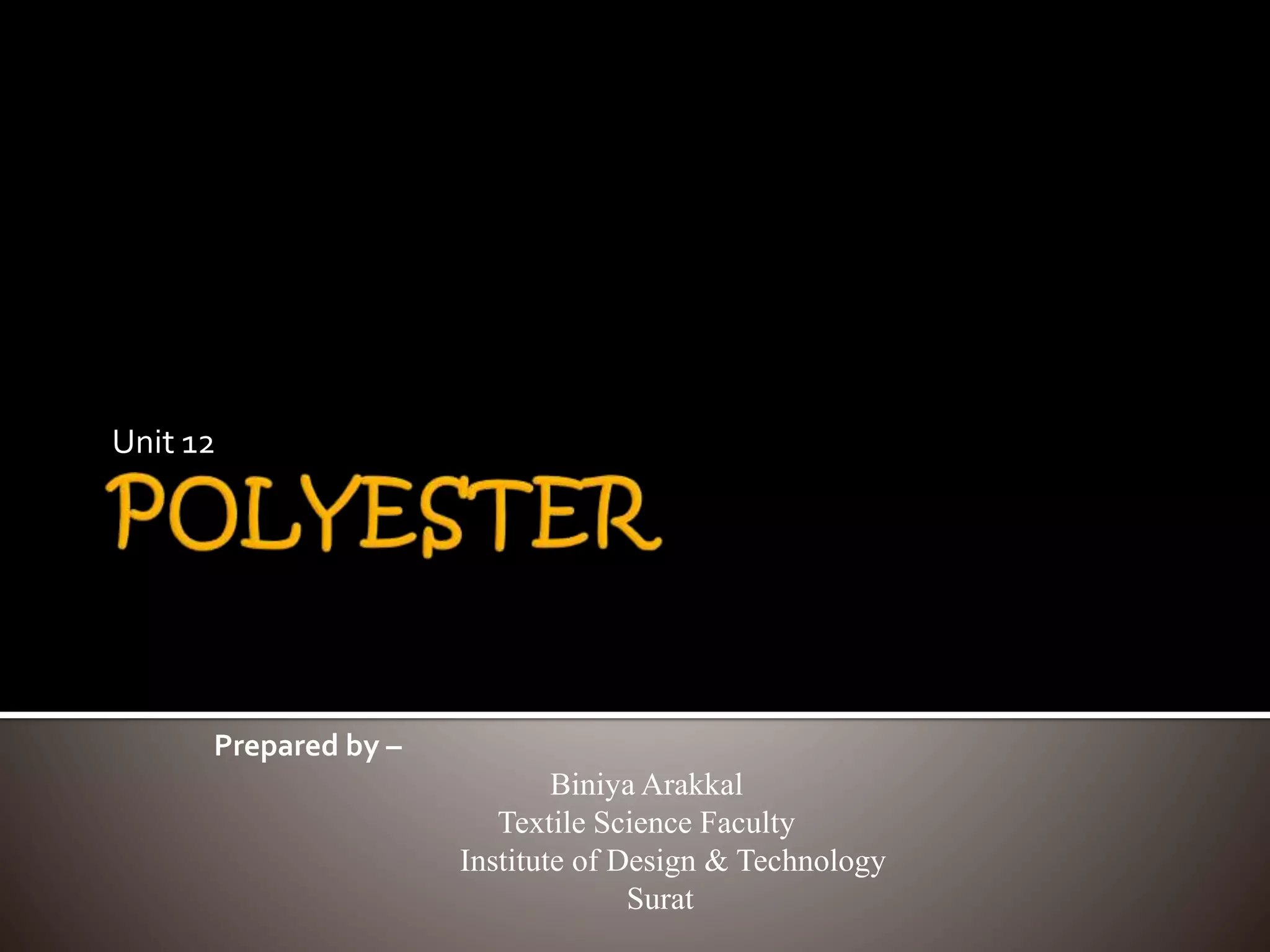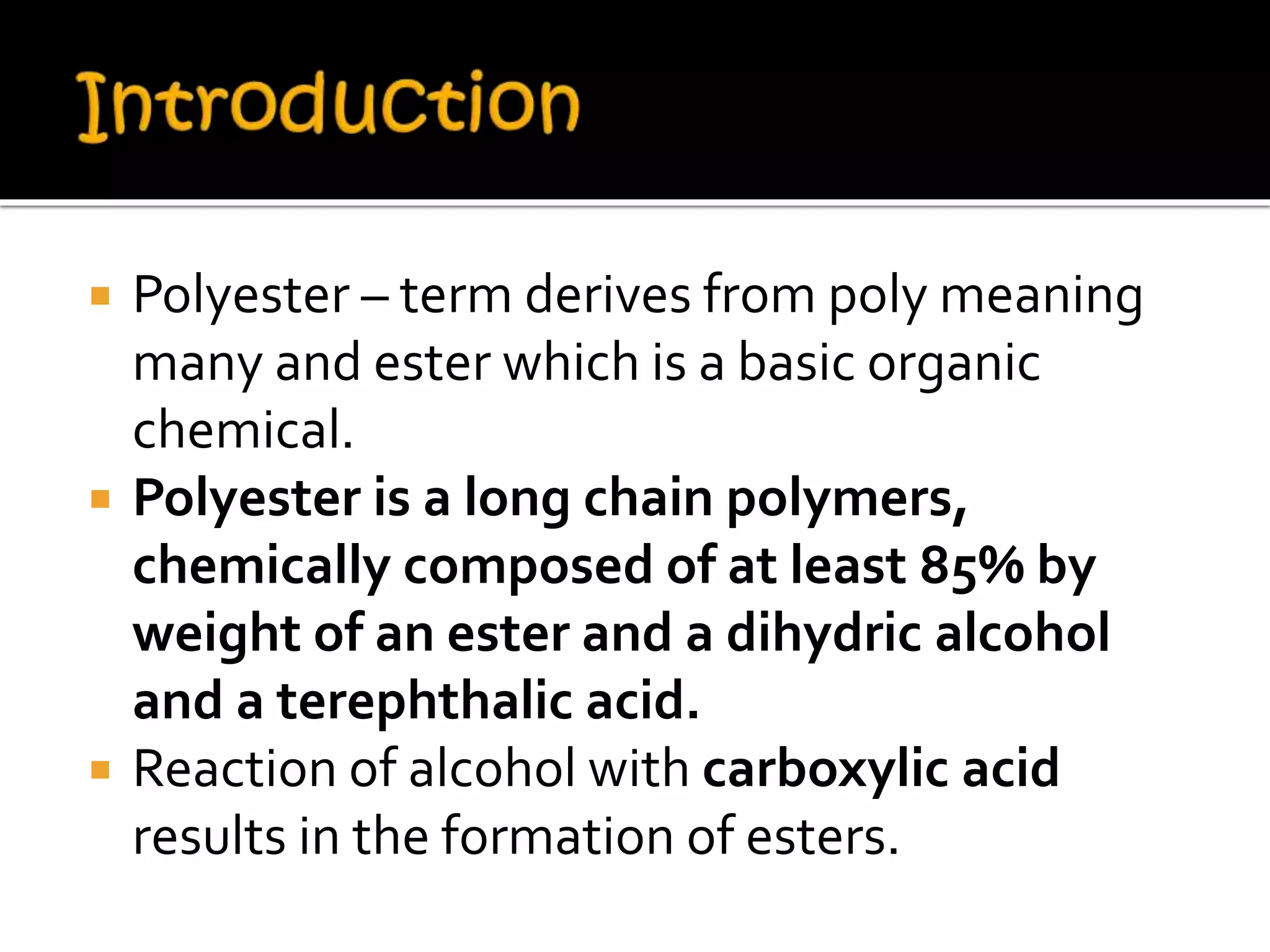 Polyester is a long chain polymer composed of at least 85% by weight of an ester and a dihydric alcohol and terephthalic acid. It has good strength and resilience but is stiff and hard to handle. Polyester is hydrophobic, retains its shape after washing, and is easy to wash and dry. It is used for clothing, suits, ropes, and plastic bottles due to its desirable properties including strength, durability, and resistance to wrinkling, insects, and perspiration.