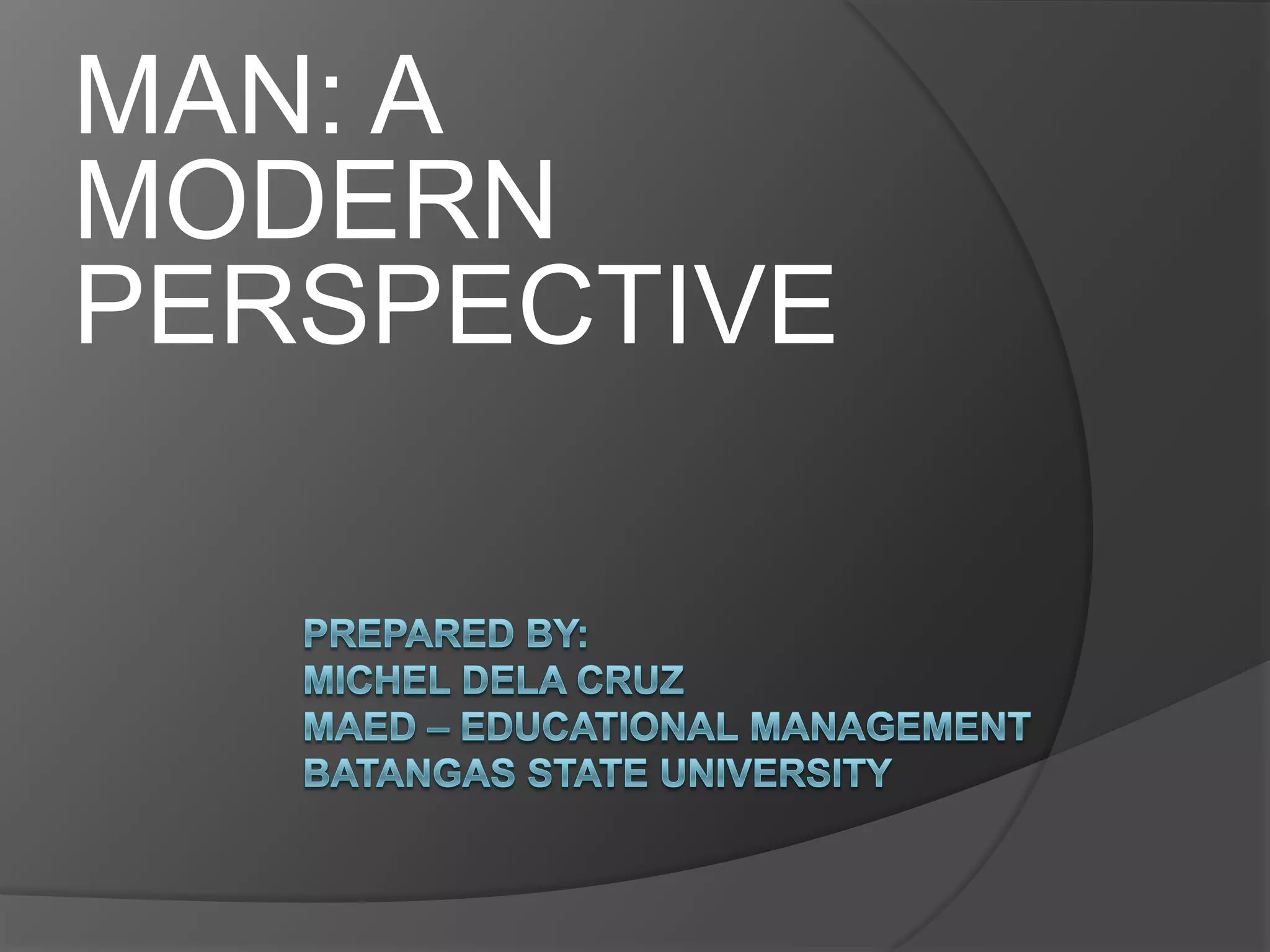 The document discusses different perspectives on the nature and characteristics of modern man. It explores how man's nature can be modified through social interaction and education. While man possesses rational thinking, he is also susceptible to evil influences from society. There are differing views on whether man's nature is essentially good or tainted by evil. The document also examines what constitutes the highest good and how man seeks happiness through achieving what he considers good in life.