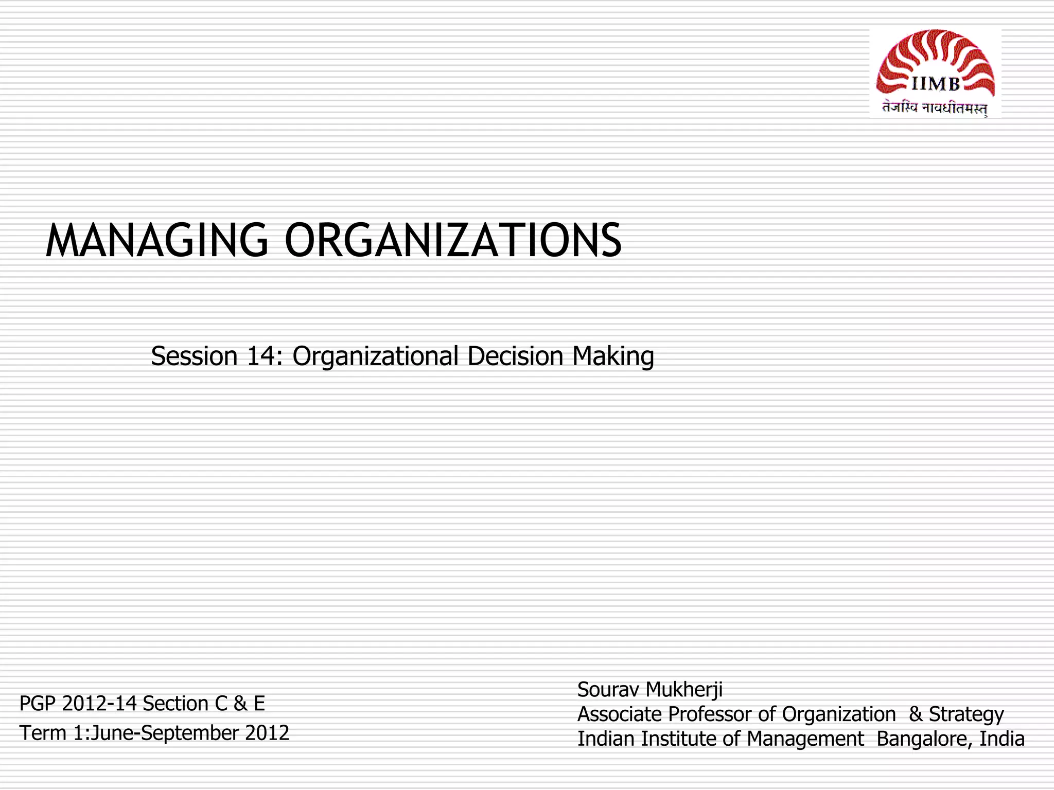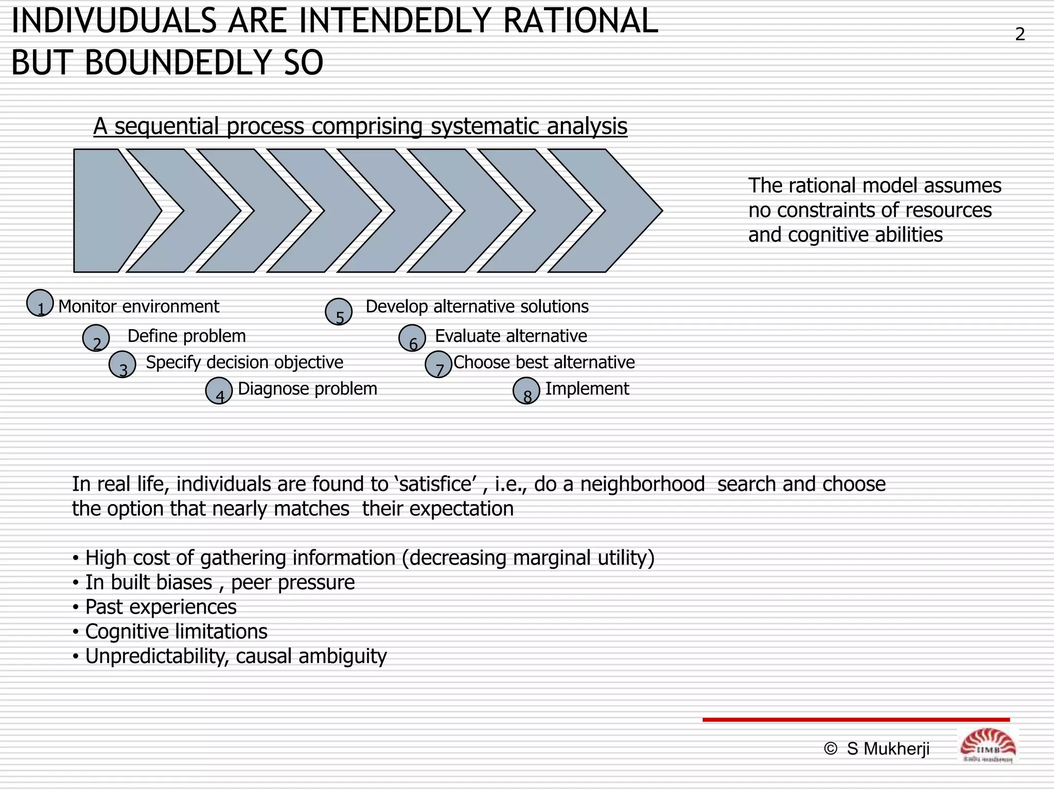 This document discusses organizational decision making. It begins by noting that while rational decision making models assume no constraints, in reality individuals and organizations are boundedly rational due to limited resources, cognitive abilities, and other factors. Decision making processes in organizations are further complicated by multiple objectives, actors with different interests, and interdependencies. The case of McDonnell Douglas DC-10's defective doors is presented to illustrate how organizational decisions can go wrong due to these complexities. Key lessons are the need for awareness of non-rational factors in decision making and giving consideration to alternative viewpoints and potential mistakes.