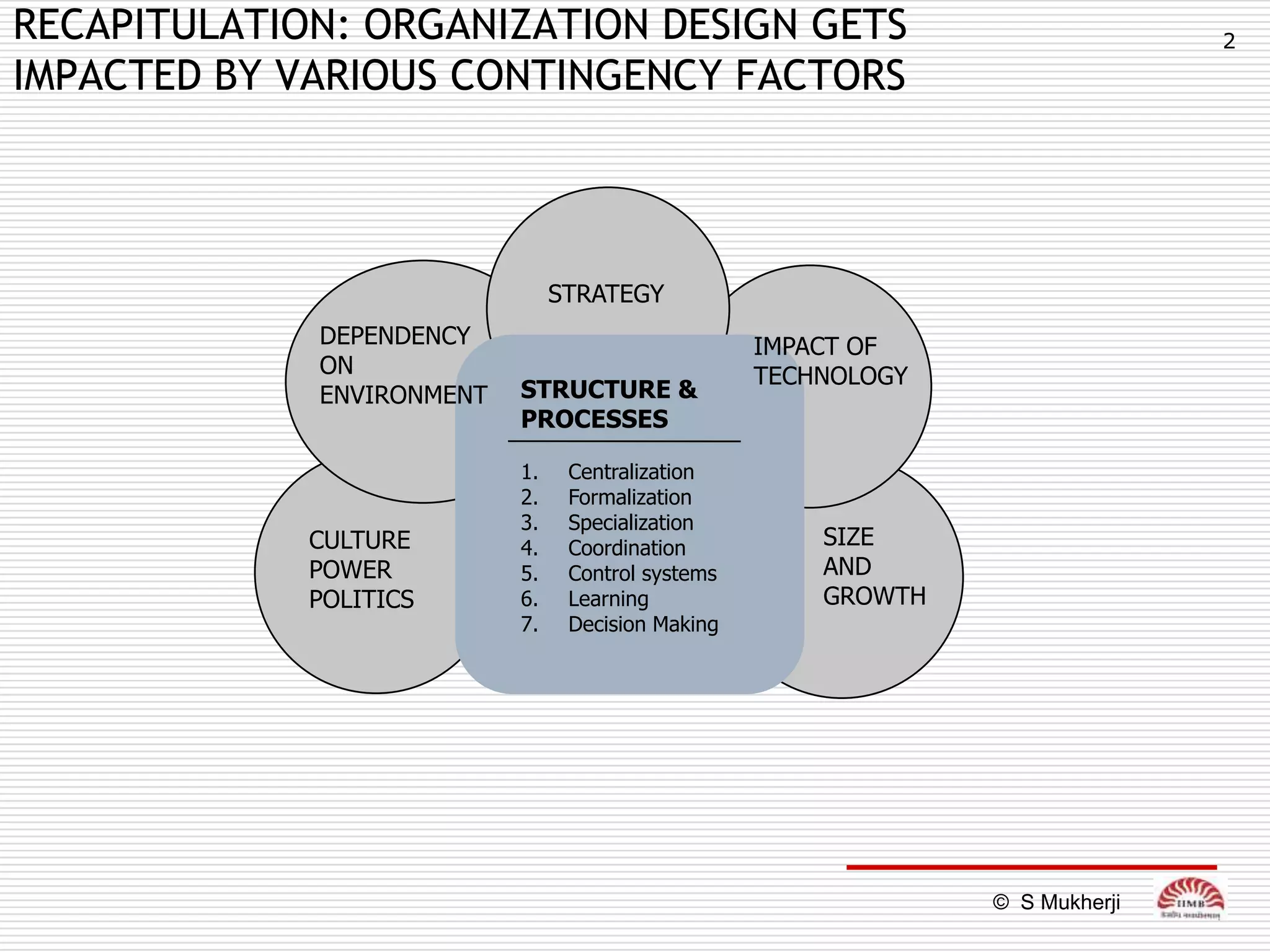 The document discusses how technology impacts organizational structure. It presents three frameworks for classifying technology: Woodward's organizational technology framework classifies production processes based on degree of automation; Thomson's framework looks at inter-unit interdependencies based on production linkages; and Perrow's framework categorizes technologies based on task analyzability and variability. The frameworks are then used to examine how different technologies require different structural designs and coordination mechanisms within organizations. Advances in manufacturing technology like customization and flexibility are also discussed in terms of their impact on redesigning organizational structures and processes.