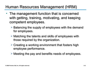 The document discusses several key aspects of human resource management including: