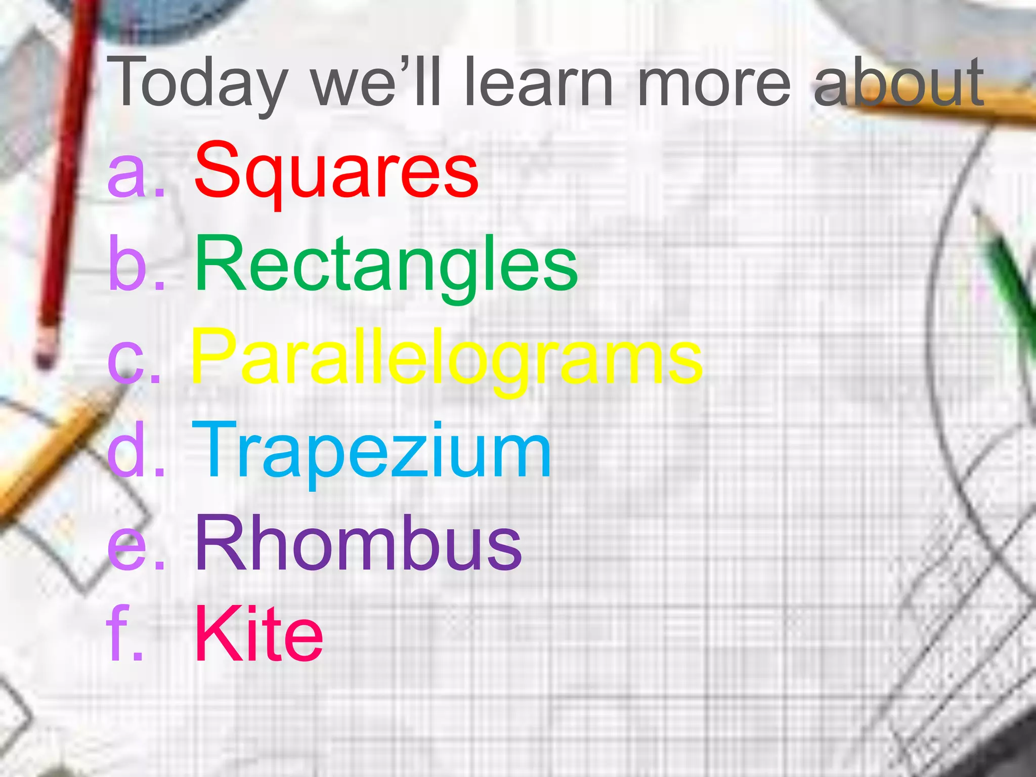 This document defines and provides properties of various quadrilaterals: squares have equal sides and right angles; parallelograms have opposite sides that are equal and parallel; kites have perpendicular diagonals with the longer diagonal bisecting the shorter; trapezoids have one set of parallel sides; rectangles have opposite sides that are equal length and parallel with right angles; and rhombuses have equal sides and diagonals that bisect and are perpendicular to each other. Cool facts about squares include that they are also parallelograms, rhombuses, trapezoids, and rectangles with 4 lines of symmetry and specific relationships between sides, angles, and diagonals. Formulas for perimeter and area of some shapes