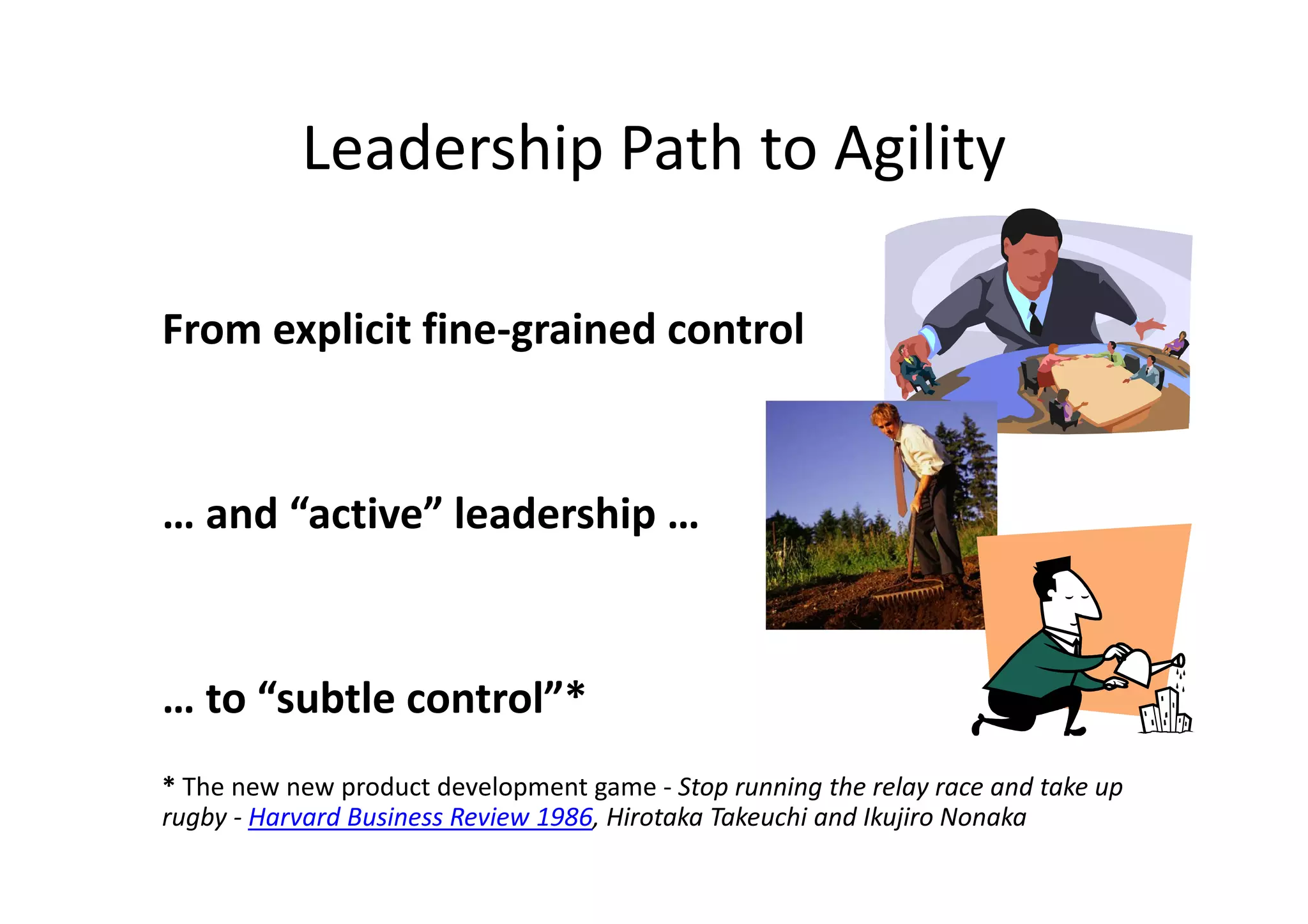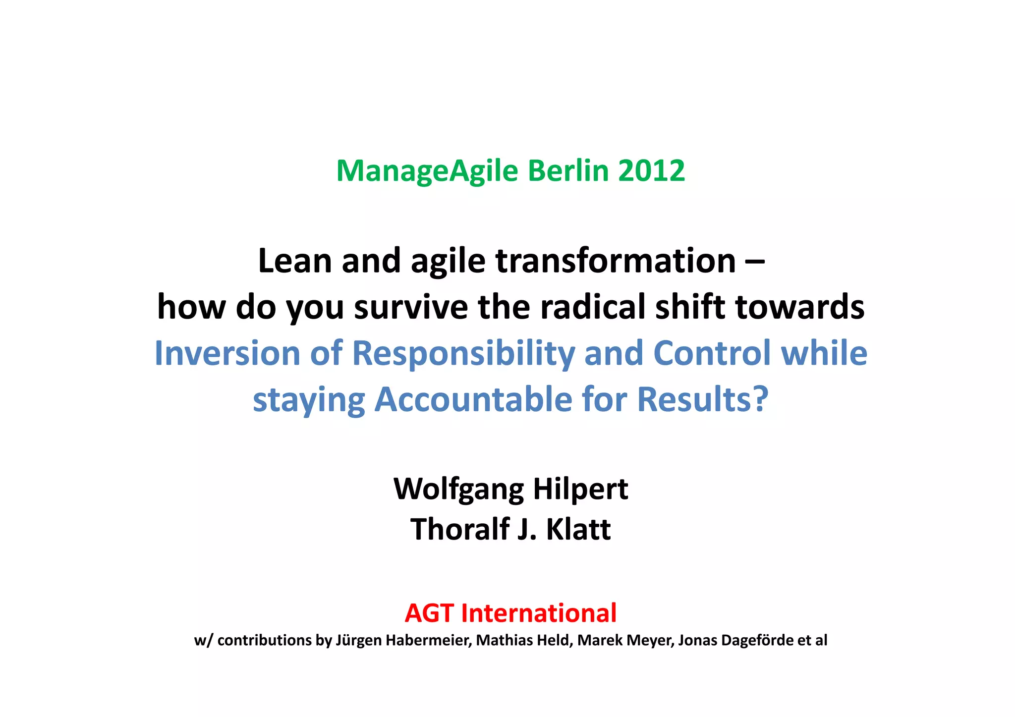 This document summarizes a presentation on managing the transition from traditional waterfall development to agile development. It discusses: