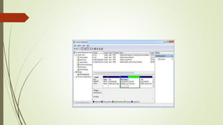 Disk Management allows managing drives and partitions on a computer. It can partition drives, format them, assign letters, and more. To open Disk Management, run "diskmgmt.msc". Disks can be partitioned into primary, extended, and logical partitions. Partition style is MBR for disks under 2TB and GPT for larger disks. Common file systems are FAT, NTFS, and exFAT. FAT tracks files using allocation tables of 8, 12, 16 or 32 bits. NTFS is Windows' standard and exFAT supports larger files. To create a partition, shrink an existing volume in Disk Management, then allocate the unallocated space to a new simple volume, assign a letter, and format.