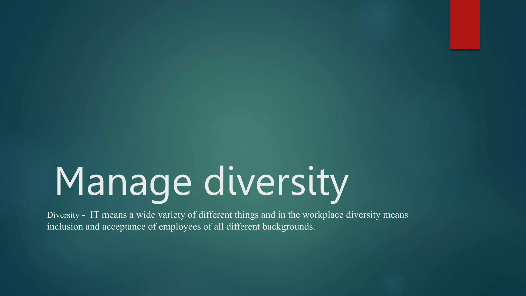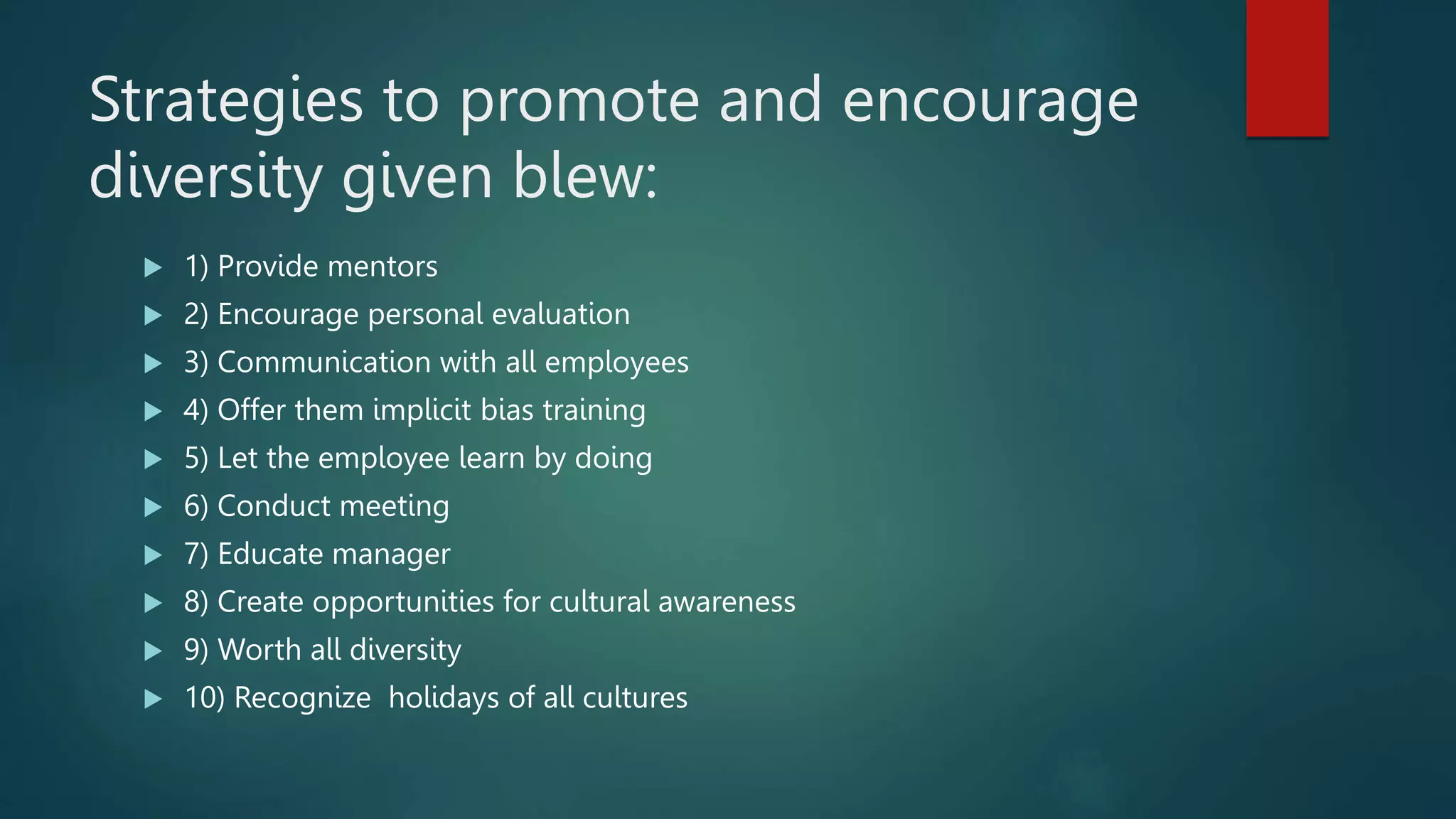 The document discusses the importance of diversity in the workplace, emphasizing the inclusion of employees from various backgrounds. It outlines strategies for promoting diversity, such as providing mentorship and conducting implicit bias training, and highlights the benefits of diversity, including increased innovation, creativity, and profitability. Additionally, it details how diversity contributes to organizational growth and effectiveness by fostering new perspectives and enhancing problem-solving capabilities.