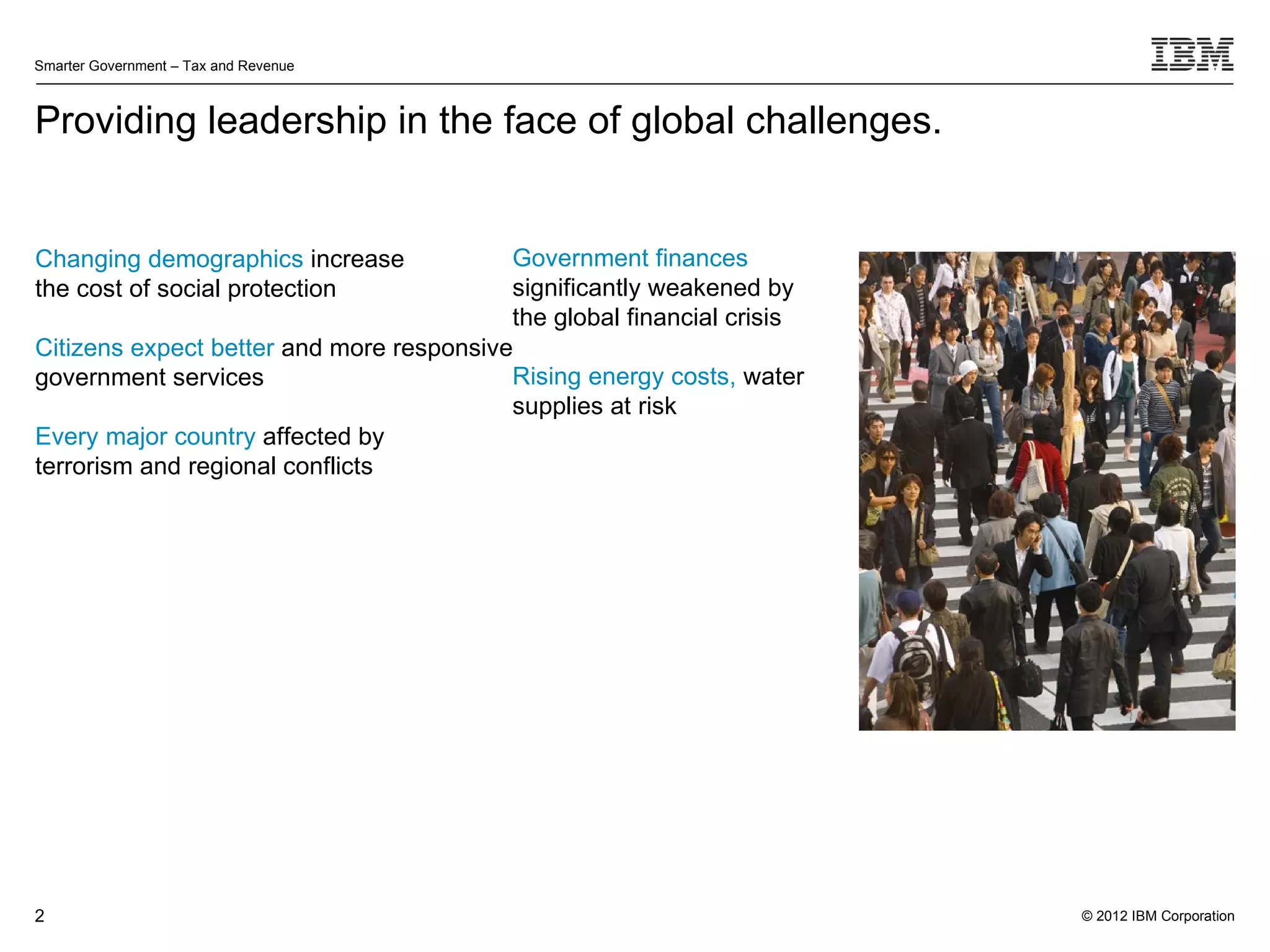 The document discusses challenges faced by governments in tax collection and revenue management. It presents opportunities to improve efficiency, reduce fraud and waste, and increase tax compliance through modernization of tax administration systems. Key strategies discussed include implementing a single view of taxpayers, predictive analytics for fraud detection, tax system modernization, and financial performance management to improve transparency and accountability. The presentation considers alternative approaches and implementation options to address these challenges.