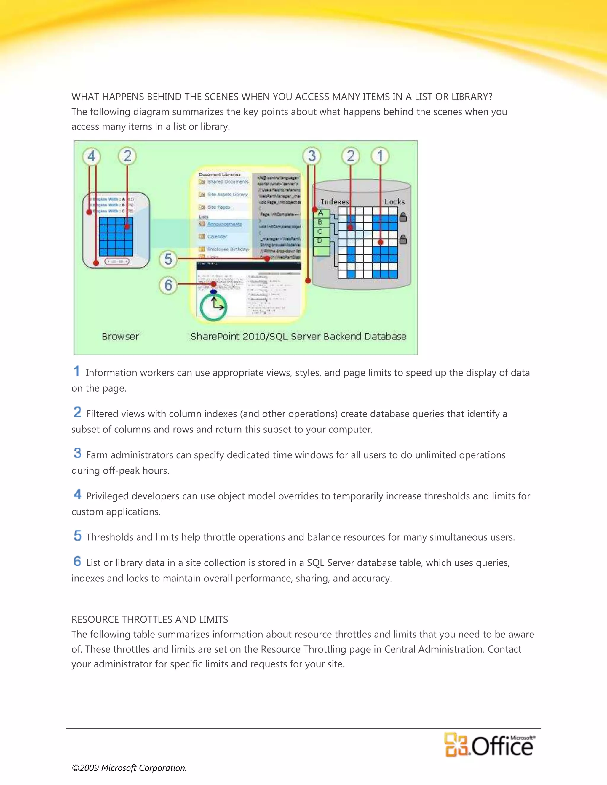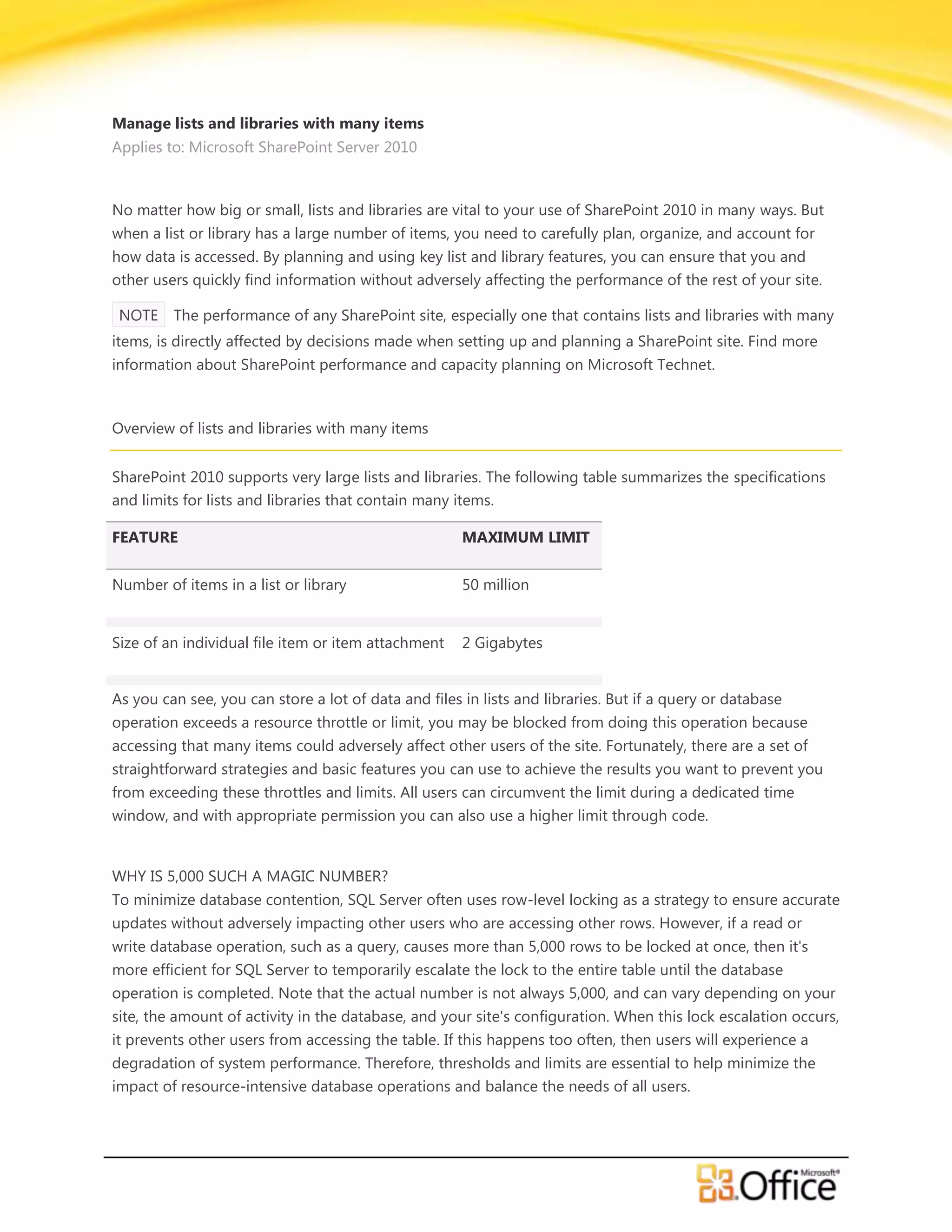 The document outlines guidelines for managing large lists and libraries in Microsoft SharePoint Server 2010, highlighting the need for careful planning to maintain site performance. It discusses specifications, limits on items, and strategies for filtering and organizing data to improve access while avoiding performance issues due to SQL Server constraints. Key recommendations include using indexed columns, filtered views, and structured organization through folders, along with tips for optimizing data display and retrieval efficiency.