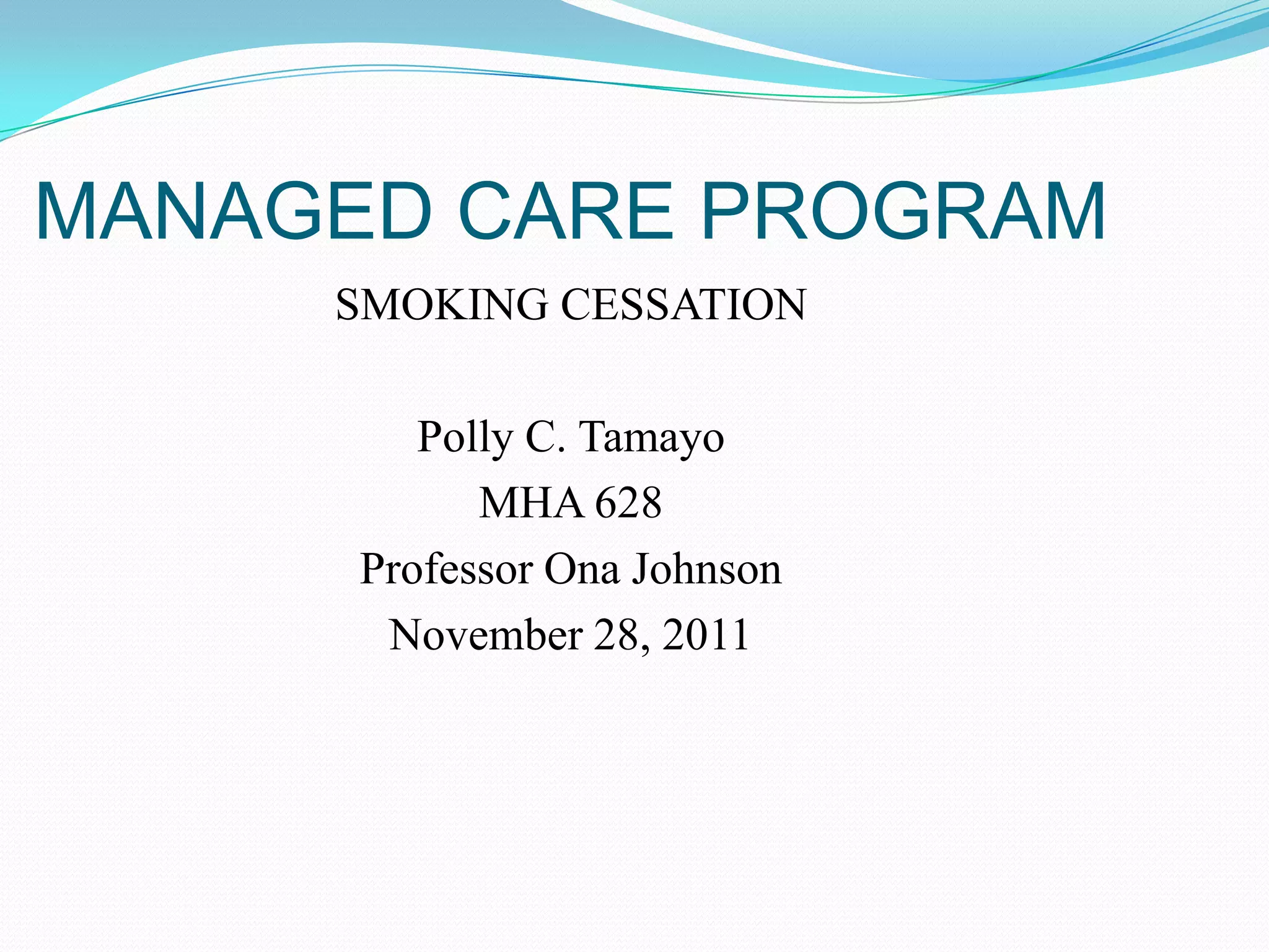 Chronic diseases are the leading cause of death in the US. Managed care organizations implement disease management programs like smoking cessation programs to help prevent chronic diseases and lower costs. These programs aim to eliminate risk factors for disease such as smoking and provide incentives, care management, and access to services to help patients quit smoking. Quality of care is evaluated through structure, process and outcomes to ensure these programs are effective.