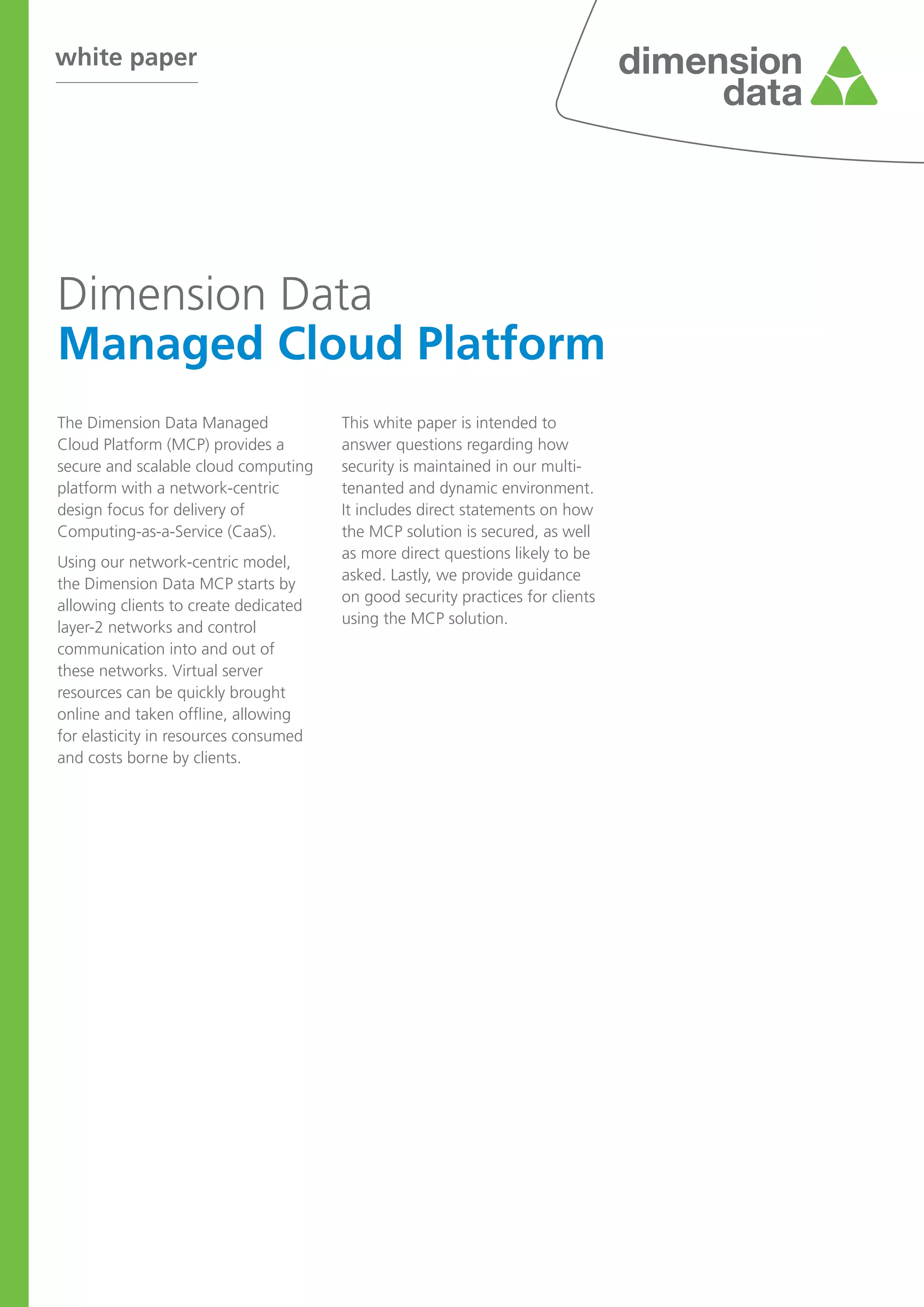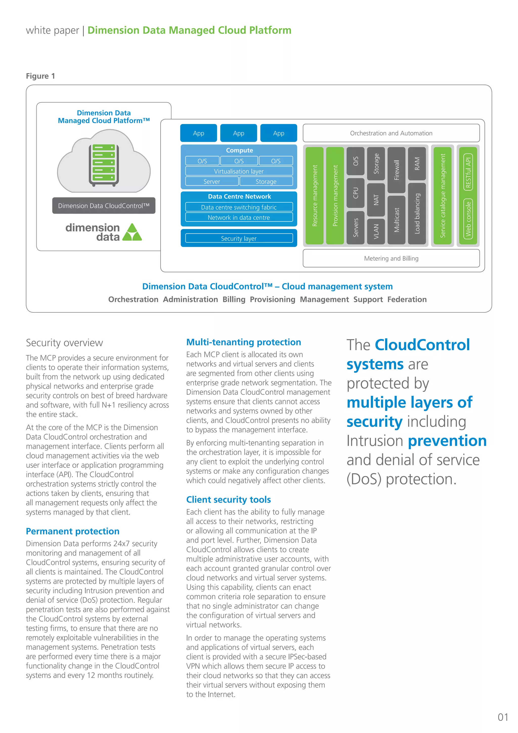 The document provides an overview of the security features and architecture of the Dimension Data Managed Cloud Platform (MCP). Key points include: